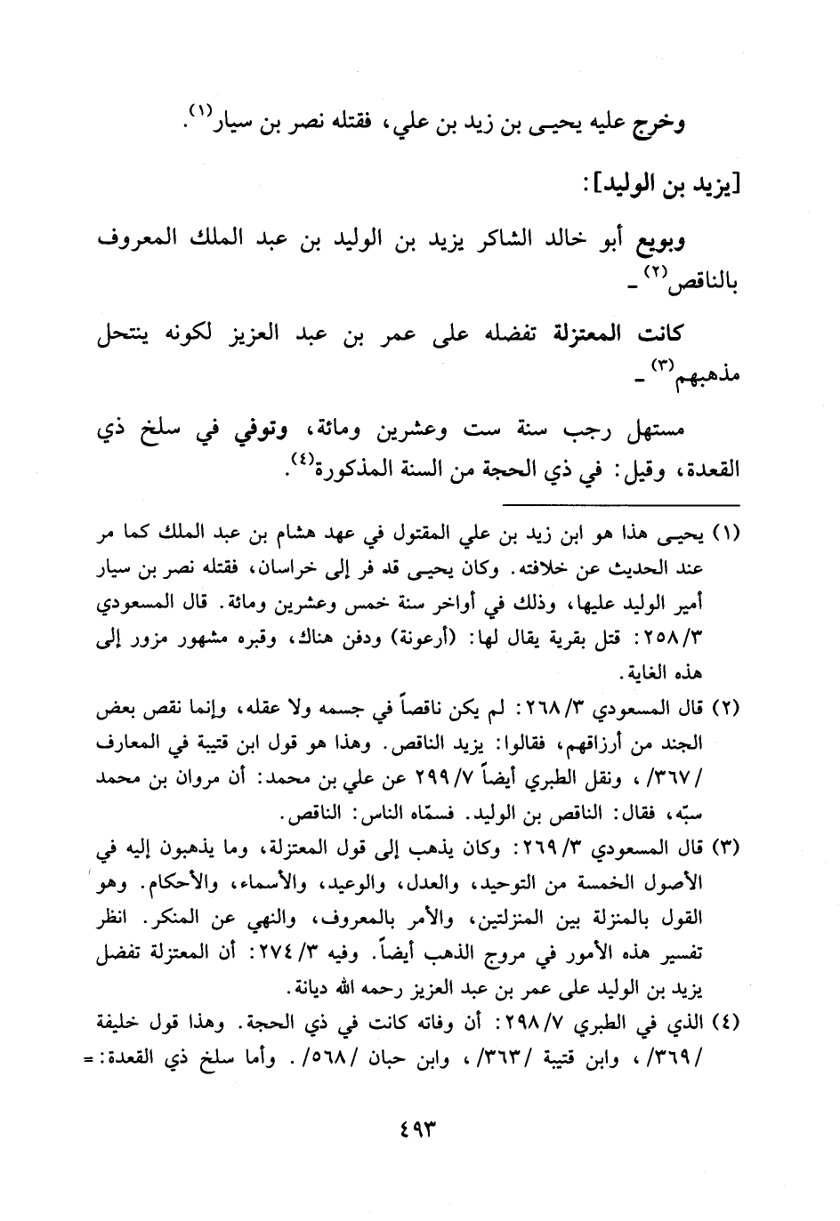 (¬3) قال المسعودي 3/ 269: وكان يذهب إلى قول المعتزلة، وما يذهبون إليه في الأصول الخمسة من التوحيد، والعدل، والوعيد، والأسماء، والأحكام. وهو القول بالمنزلة بين المنزلتين، والأمر بالمعروف، والنهي عن المنكر. انظر تفسير هذه الأمور في مروج الذهب أيضا. وفيه 3/ 274: أن المعتزلة تفضل يزيد بن الوليد على عمر بن عبد العزيز رحمه الله ديانة.
