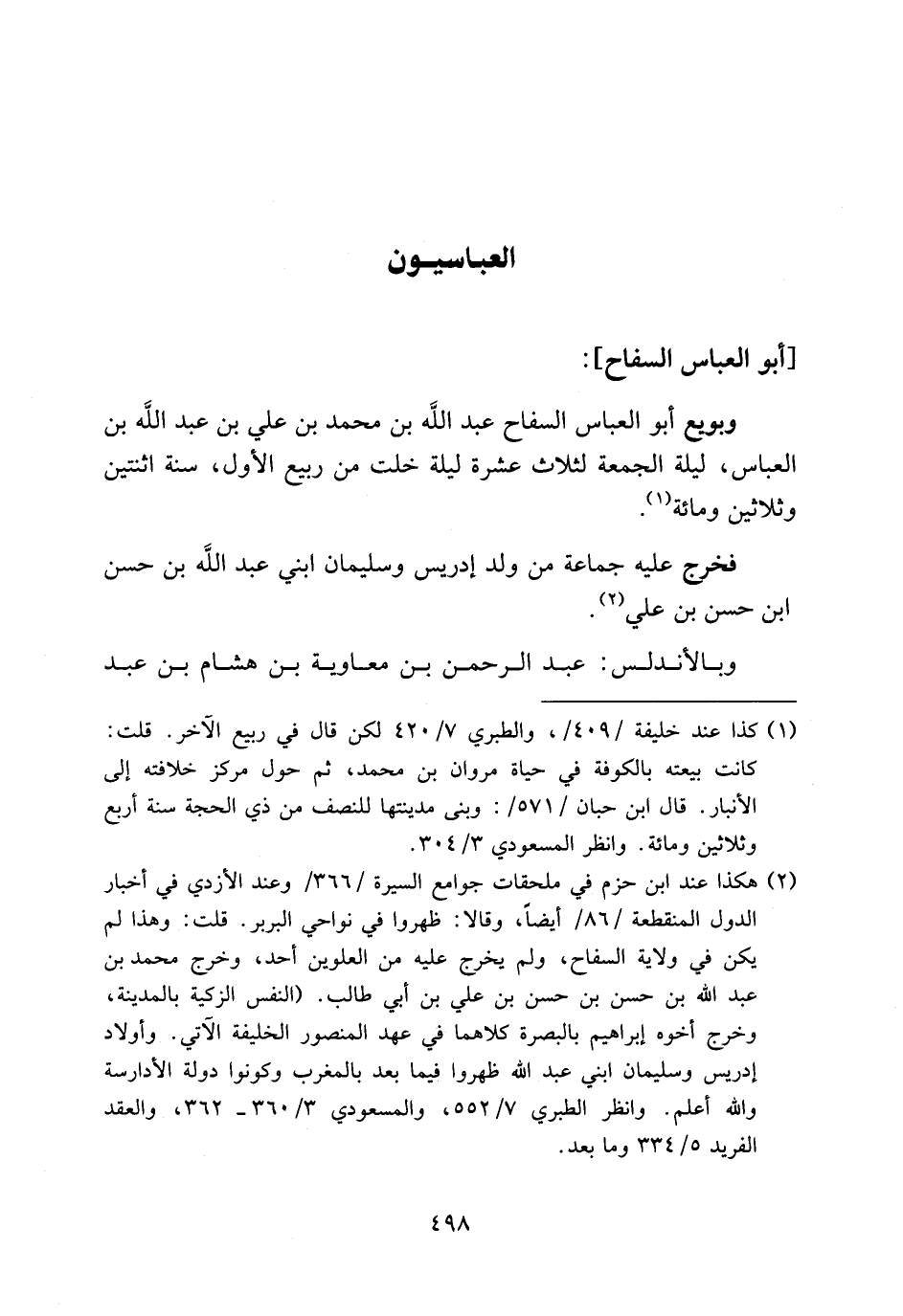 (¬2) هكذا عند ابن حزم في ملحقات جوامع السيرة/366/وعند الأزدي في أخبار الدول المنقطعة/86/أيضا، وقالا: ظهروا في نواحي البربر. قلت: وهذا لم يكن في ولاية السفاح، ولم يخرج عليه من العلوين أحد، وخرج محمد بن عبد الله بن حسن بن حسن بن علي بن أبي طالب. (النفس الزكية بالمدينة، وخرج أخوه إبراهيم بالبصرة كلاهما في عهد المنصور الخليفة الآتي. وأولاد إدريس وسليمان ابني عبد الله ظهورا فيما بعد بالمغرب وكونوا دولة الأدارسة والله أعلم. وانظر الطبري 7/ 552، والمسعودي 3/ 360 - 362، والعقد الفريد 5/ 334 وما بعد.