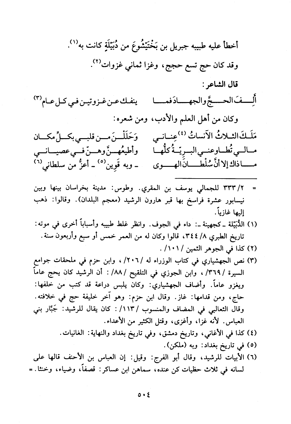 (¬3) نص الجهشياري في كتاب الوزراء له/206/، وابن حزم في ملحقات جوامع السيرة/369/، وابن الجوزي في التلقيح/88/: أن الرشيد كان يحج عاما ويغزو عاما. وأضاف الجهشياري: وكان يلبس دراعة قد كتب من خلفها: حاج، ومن قدامها: غاز. وقال ابن حزم: وهو آخر خليفة حج في خلافته. وقال الثعالبي في المضاف والمنسوب/113/: كان يقال للرشيد: جبّار بني العباس. لأنه غزا، وأغزى، وقتل الكثير من الأعداء.