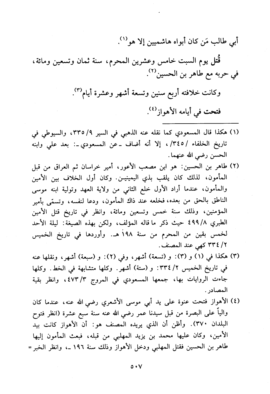 (¬4) الأهواز فتحت عنوة على يد أبي موسى الأشعري رضي الله عنه، عندما كان واليا على البصرة من قبل سيدنا عمر رضي الله عنه سنة سبع عشرة (انظر فتوح البلدان 370). وأظن أن الذي يريده المصنف هو: أن الأهواز كانت بيد الأمين، وكان عليها محمد بن يزيد المهلبي من قبله، فبعث المأمون إليها طاهر بن الحسين فقتل المهلبي ودخل الأهواز وذلك سنة 196 - ، وانظر الخبر-