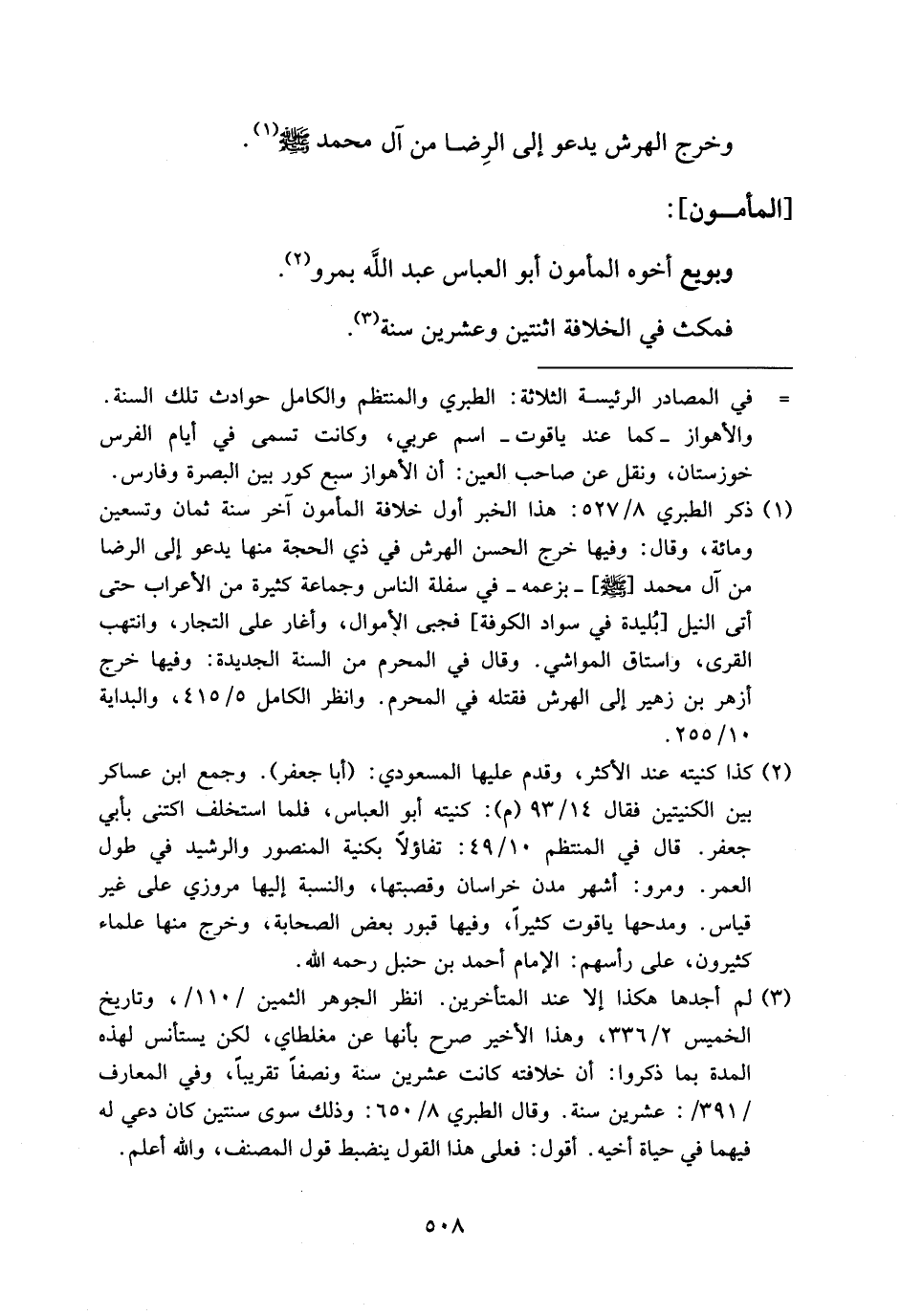 (¬3) لم أجدها هكذا إلا عند المتأخرين. انظر الجوهر الثمين/110/، وتاريخ الخميس 2/ 336، وهذا الأخير صرح بأنها عن مغلطاي، لكن يستأنس لهذه المدة بما ذكروا: أن خلافته كانت عشرين سنة ونصفا تقريبا، وفي المعارف /391/: عشرين سنة. وقال الطبري 8/ 650: وذلك سوى سنتين كان دعي له فيهما في حياة أخيه. أقول: فعلى هذا القول ينضبط قول المصنف، والله أعلم.