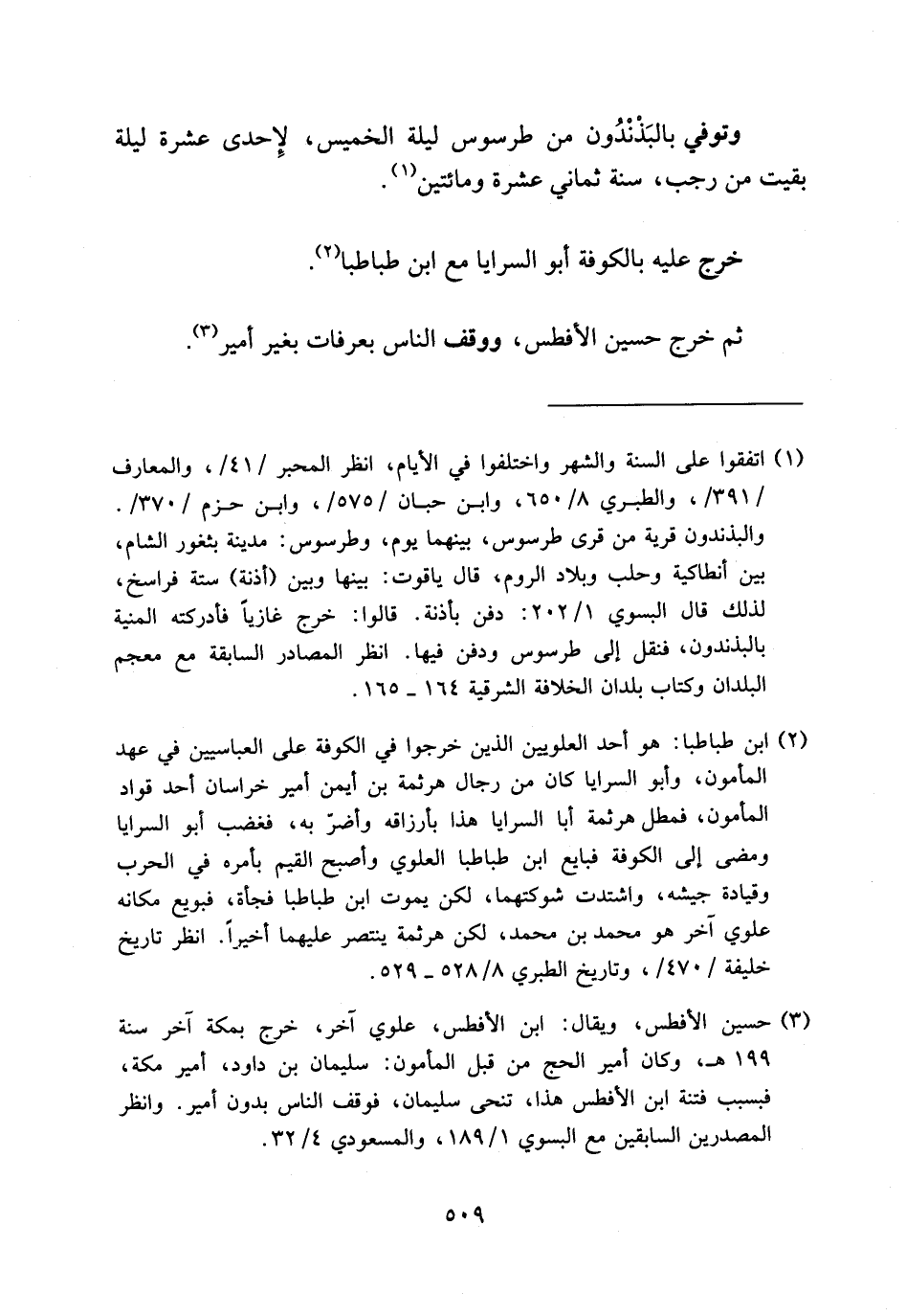 (¬2) ابن طباطبا: هو أحد العلويين الذين خرجوا في الكوفة على العباسيين في عهد المأمون، وأبو السرايا كان من رجال هرثمة بن أيمن أمير خراسان أحد قواد المأمون، فمطل هرثمة أبا السرايا هذا بأرزاقه وأضرّ به، فغضب أبو السرايا ومضى إلى الكوفة فبايع ابن طباطبا العلوي وأصبح القيم بأمره في الحرب وقيادة جيشه، واشتدت شوكتهما، لكن يموت ابن طباطبا فجأة، فبويع مكانه علوي آخر هو محمد بن محمد، لكن هرثمة ينتصر عليهما أخيرا. انظر تاريخ خليفة/470/، وتاريخ الطبري 8/ 528 - 529.