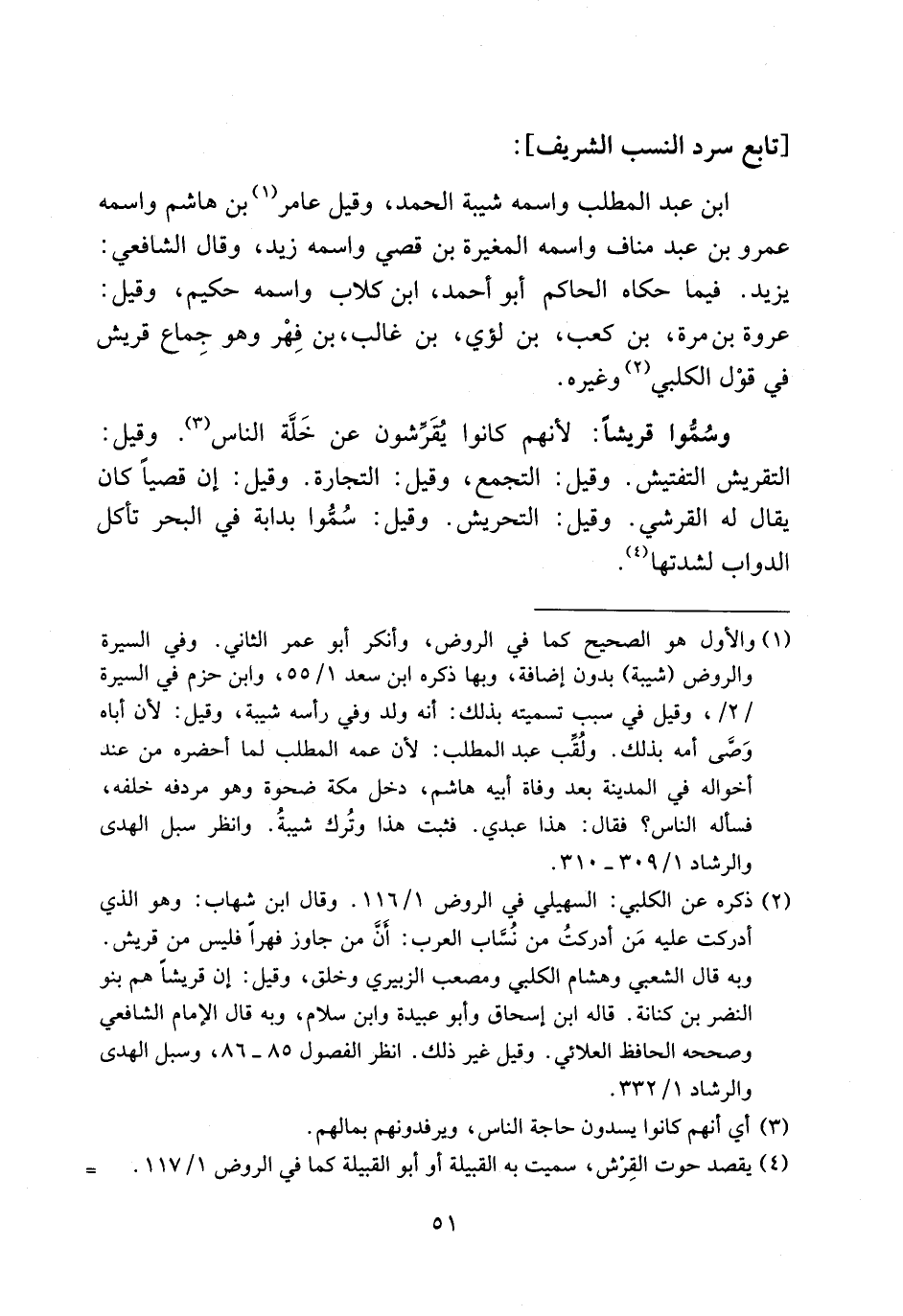 (¬1) والأول هو الصحيح كما في الروض، وأنكر أبو عمر الثاني. وفي السيرة والروض (شيبة) بدون إضافة، وبها ذكره ابن سعد 1/ 55، وابن حزم في السيرة /2/، وقيل في سبب تسميته بذلك: أنه ولد وفي رأسه شيبة، وقيل: لأن أباه وصّى أمه بذلك. ولقّب عبد المطلب: لأن عمه المطلب لما أحضره من عند أخواله في المدينة بعد وفاة أبيه هاشم، دخل مكة ضحوة وهو مردفه خلفه، فسأله الناس؟ فقال: هذا عبدي. فثبت هذا وترك شيبة. وانظر سبل الهدى والرشاد 1/ 309 - 310.