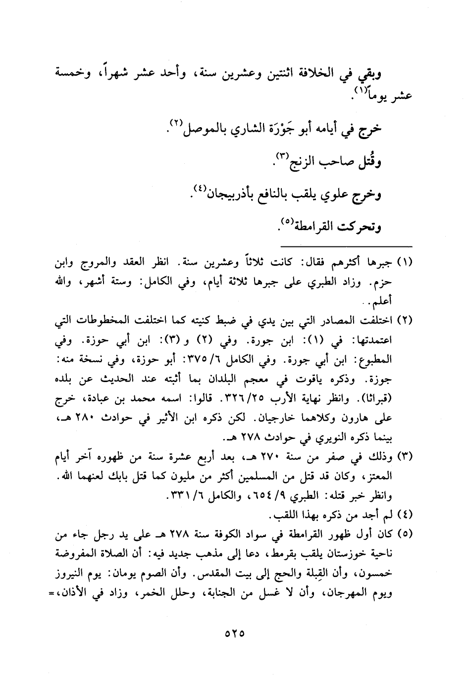(¬5) كان أول ظهور القرامطة في سواد الكوفة سنة 278 هـ على يد رجل جاء من ناحية خوزستان يلقب بقرمط، دعا إلى مذهب جديد فيه: أن الصلاة المفروضة خمسون، وأن القبلة والحج إلى بيت المقدس. وأن الصوم يومان: يوم النيروز ويوم المهرجان، وأن لا غسل من الجنابة، وحلل الخمر، وزاد في الأذان، -