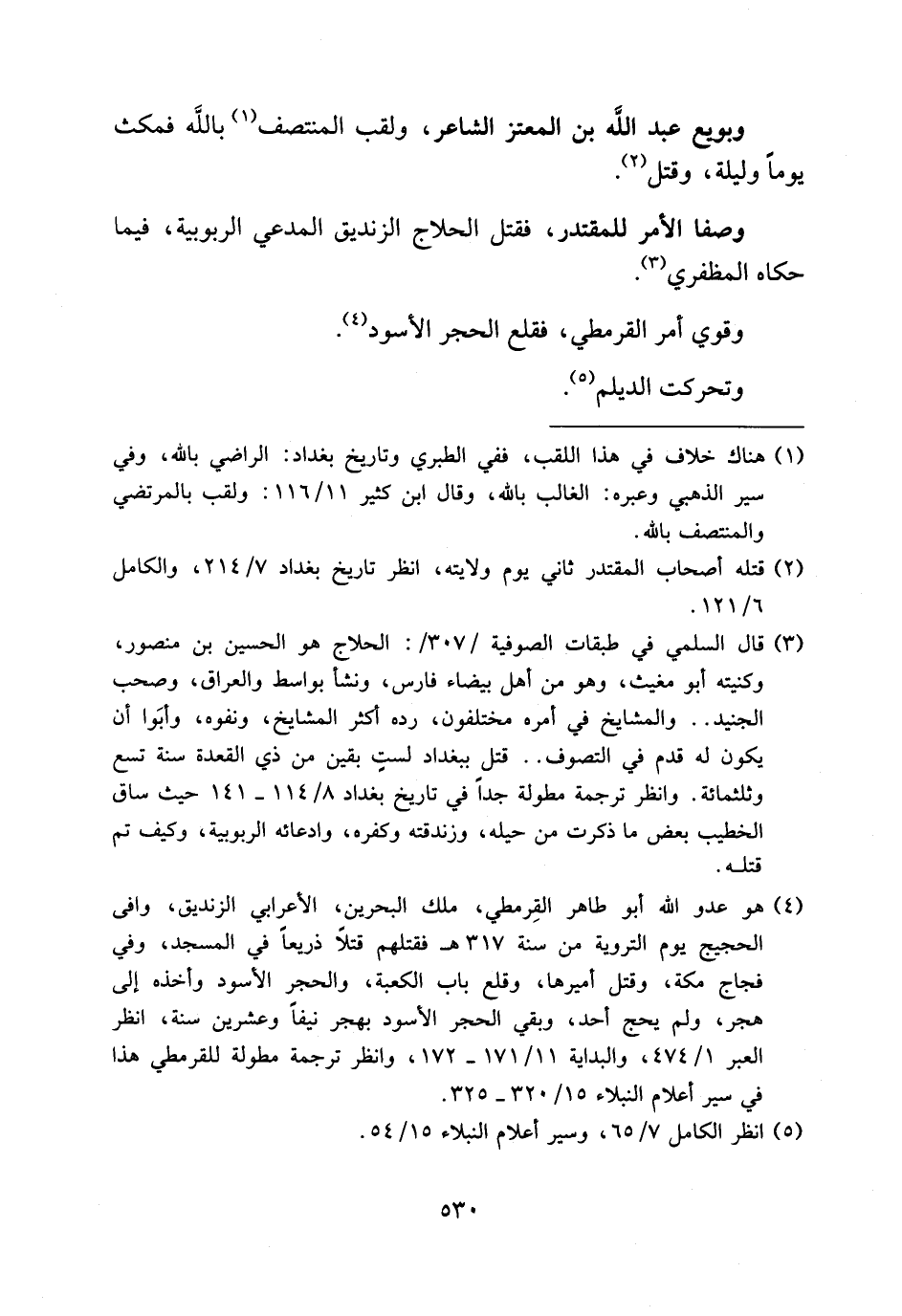 (¬2) قتله أصحاب المقتدر ثاني يوم ولايته، انظر تاريخ بغداد 7/ 214، والكامل 6/ 121.