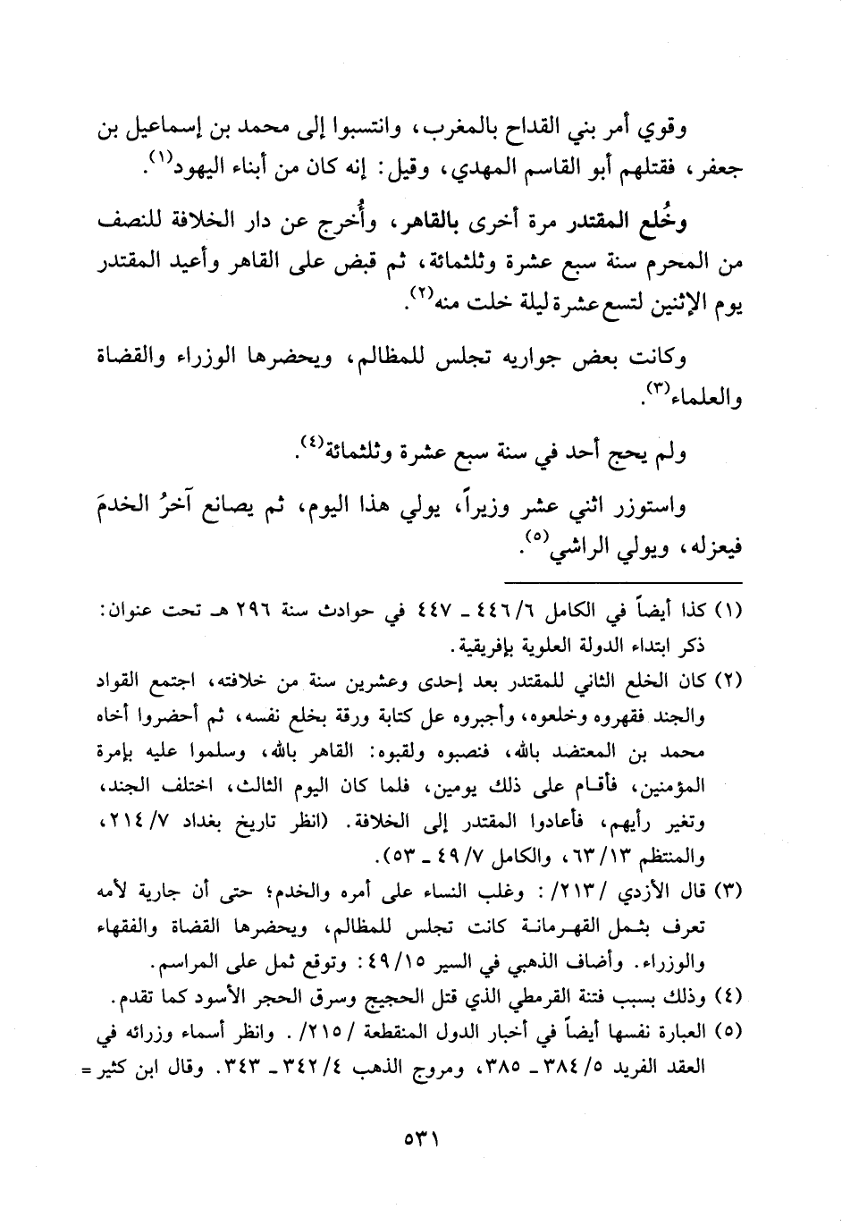(¬3) قال الأزدي/213/: وغلب النساء على أمره والخدم؛ حتى أن جارية لأمه تعرف بثمل القهرمانة كانت تجلس للمظالم، ويحضرها القضاة والفقهاء والوزراء. وأضاف الذهبي في السير 15/ 49: وتوقع ثمل على المراسم.