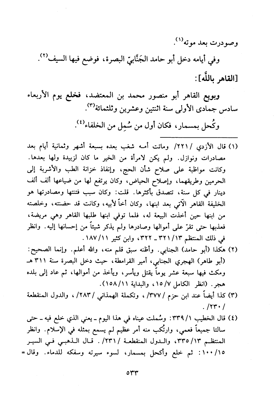 (¬4) قال الخطيب 1/ 339: وسملت عيناه في هذا اليوم-يعني الذي خلع فيه-حتى سالتا جميعا فعمي، وارتكب منه أمر عظيم لم يسمع بمثله في الإسلام. وانظر المنتظم 13/ 335، والدول المنقطعة/231/. قال الذهبي في السير 15/ 100: ثم خلع وأكحل بمسمار، لسوء سيرته وسفكه للدماء. وقال-