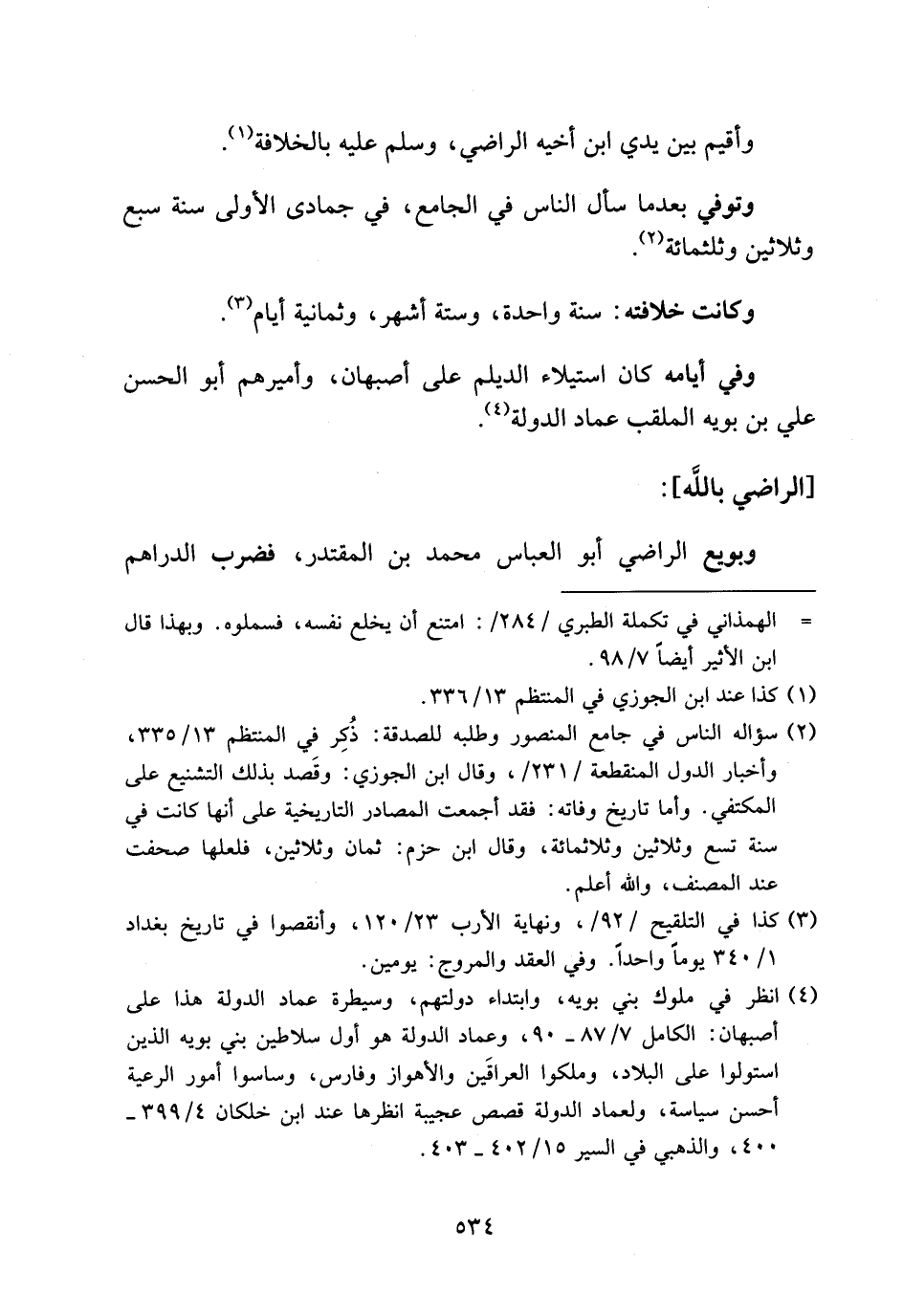 (¬2) سؤاله الناس في جامع المنصور وطلبه للصدقة: ذكر في المنتظم 13/ 335، وأخبار الدول المنقطعة/231/، وقال ابن الجوزي: وقصد بذلك التشنيع على المكتفي. وأما تاريخ وفاته: فقد أجمعت المصادر التاريخية على أنها كانت في سنة تسع وثلاثين وثلاثمائة، وقال ابن حزم: ثمان وثلاثين، فلعلها صحفت عند المصنف، والله أعلم.