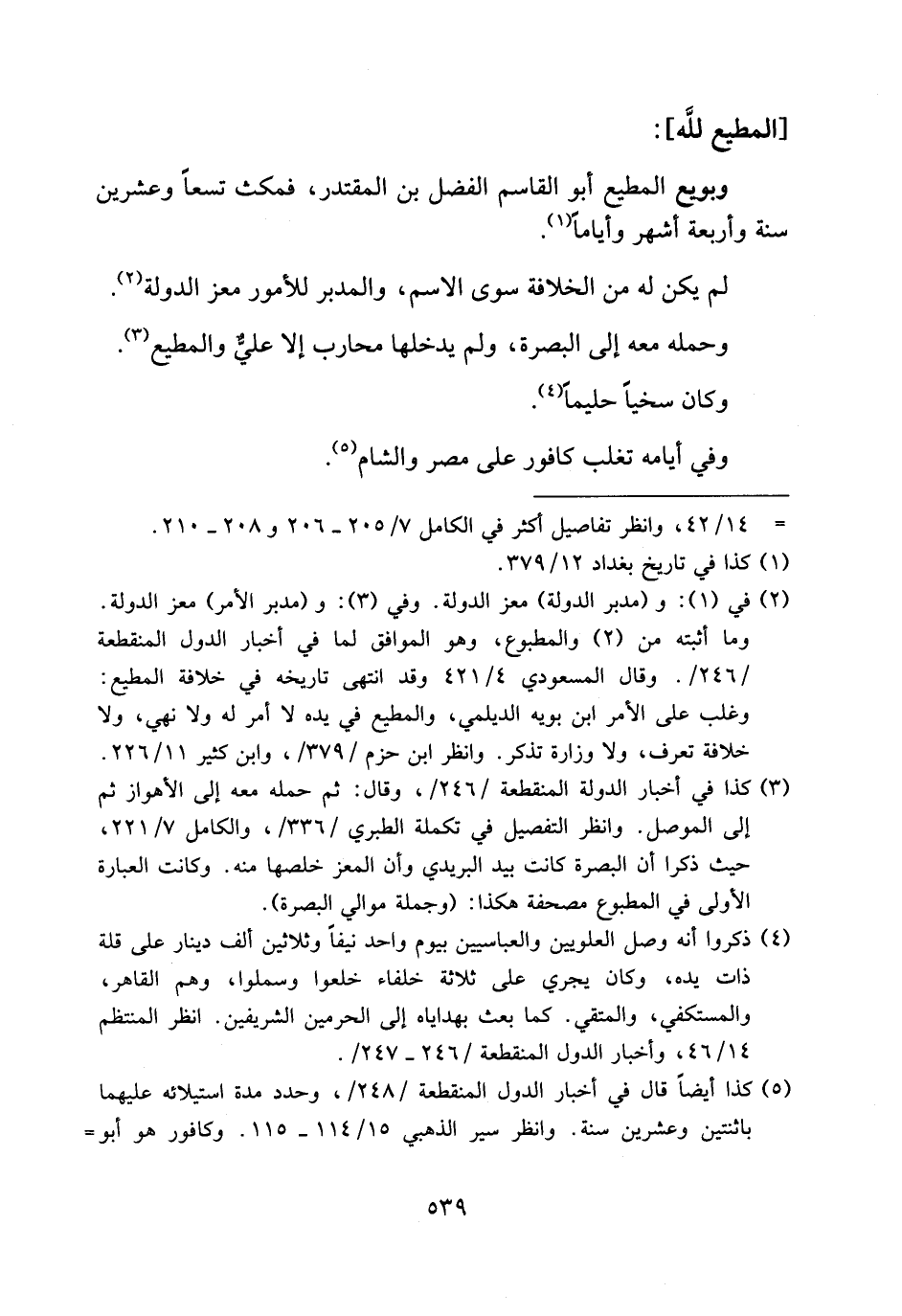 وبويع المطيع أبو القاسم الفضل بن المقتدر، فمكث تسعا وعشرين سنة وأربعة أشهر وأياما (¬1).