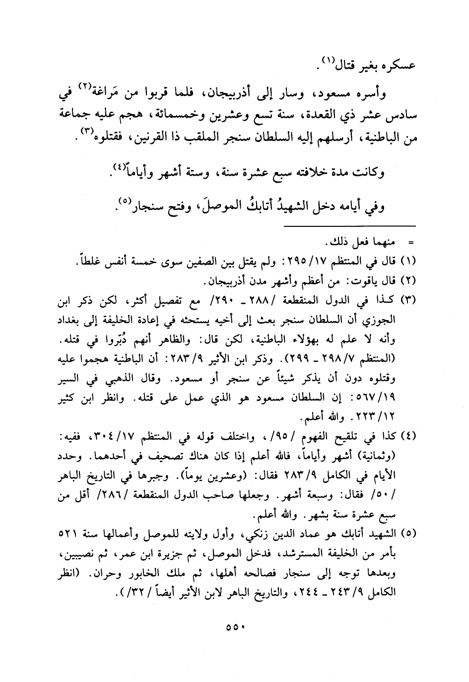 (¬3) كذا في الدول المنقطعة/288 - 290/مع تفصيل أكثر، لكن ذكر ابن الجوزي أن السلطان سنجر بعث إلى أخيه يستحثه في إعادة الخليفة إلى بغداد وأنه لا علم له بهؤلاء الباطنية، لكن قال: والظاهر أنهم دبّروا في قتله. (المنتظم 7/ 298 - 299). وذكر ابن الأثير 9/ 283: أن الباطنية هجموا عليه وقتلوه دون أن يذكر شيئا عن سنجر أو مسعود. وقال الذهبي في السير 19/ 567: إن السلطان مسعود هو الذي عمل على قتله. وانظر ابن كثير 12/ 223. والله أعلم.
