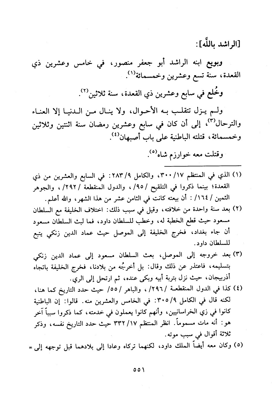(¬1) الذي في المنتظم 17/ 300، والكامل 9/ 283: في السابع والعشرين من ذي القعدة؛ بينما ذكروا في التلقيح/95/، والدول المنقطعة/292/، والجوهر الثمين/164/: أن بيعته كانت في الثامن عشر من هذا الشهر، والله أعلم.