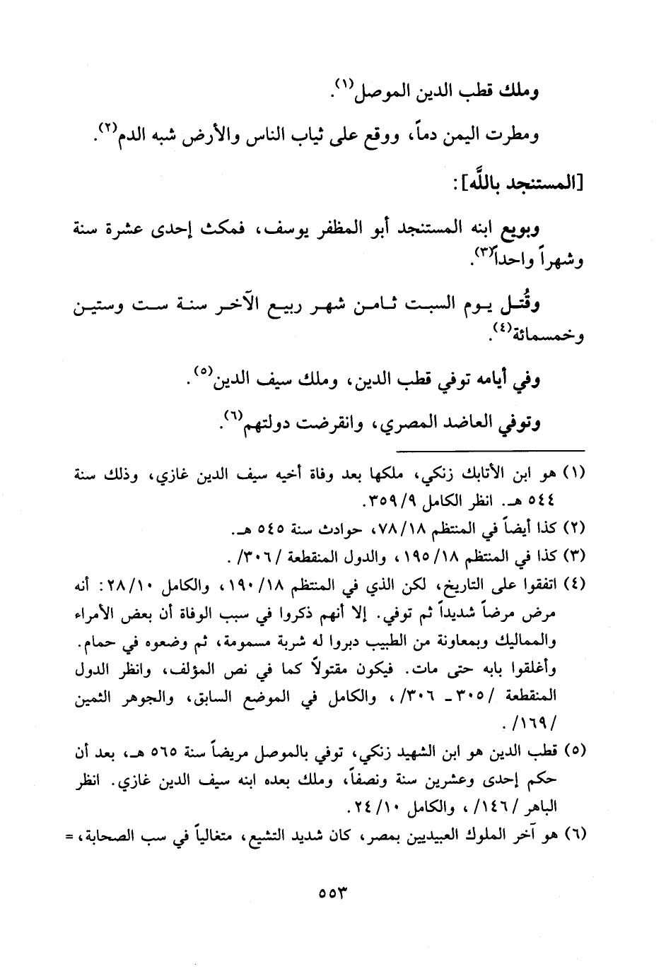 (¬5) قطب الدين هو ابن الشهيد زنكي، توفي بالموصل مريضا سنة 565 هـ، بعد أن حكم إحدى وعشرين سنة ونصفا، وملك بعده ابنه سيف الدين غازي. انظر الباهر/146/، والكامل 10/ 24.