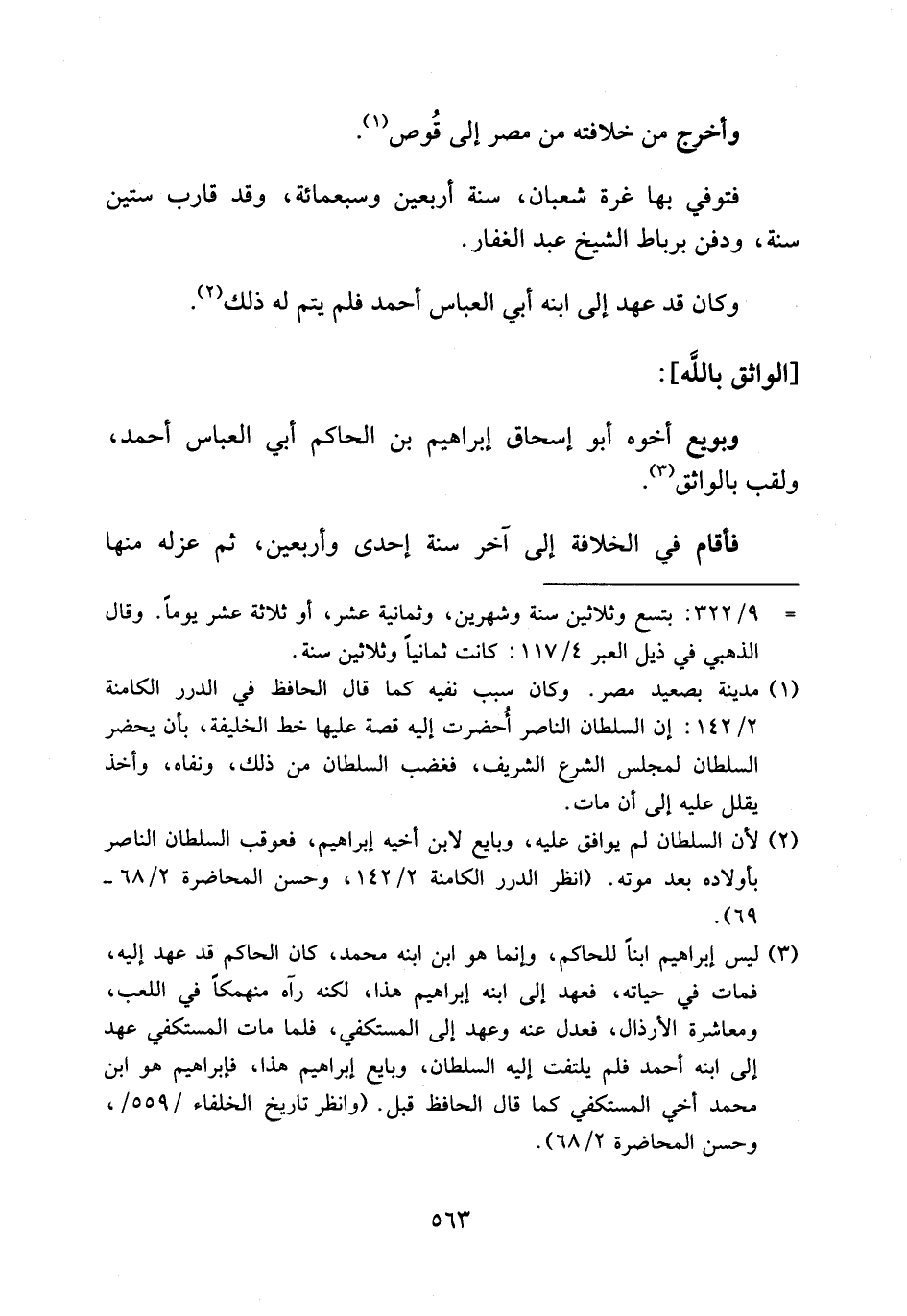 (¬3) ليس إبراهيم ابنا للحاكم، وإنما هو ابن ابنه محمد، كان الحاكم قد عهد إليه، فمات في حياته، فعهد إلى ابنه إبراهيم هذا، لكنه رآه منهمكا في اللعب، ومعاشرة الأرذال، فعدل عنه وعهد إلى المستكفي، فلما مات المستكفي عهد إلى ابنه أحمد فلم يلتفت إليه السلطان، وبايع إبراهيم هذا، فإبراهيم هو ابن محمد أخي المستكفي كما قال الحافظ قبل. (وانظر تاريخ الخلفاء/559/، وحسن المحاضرة 2/ 68).