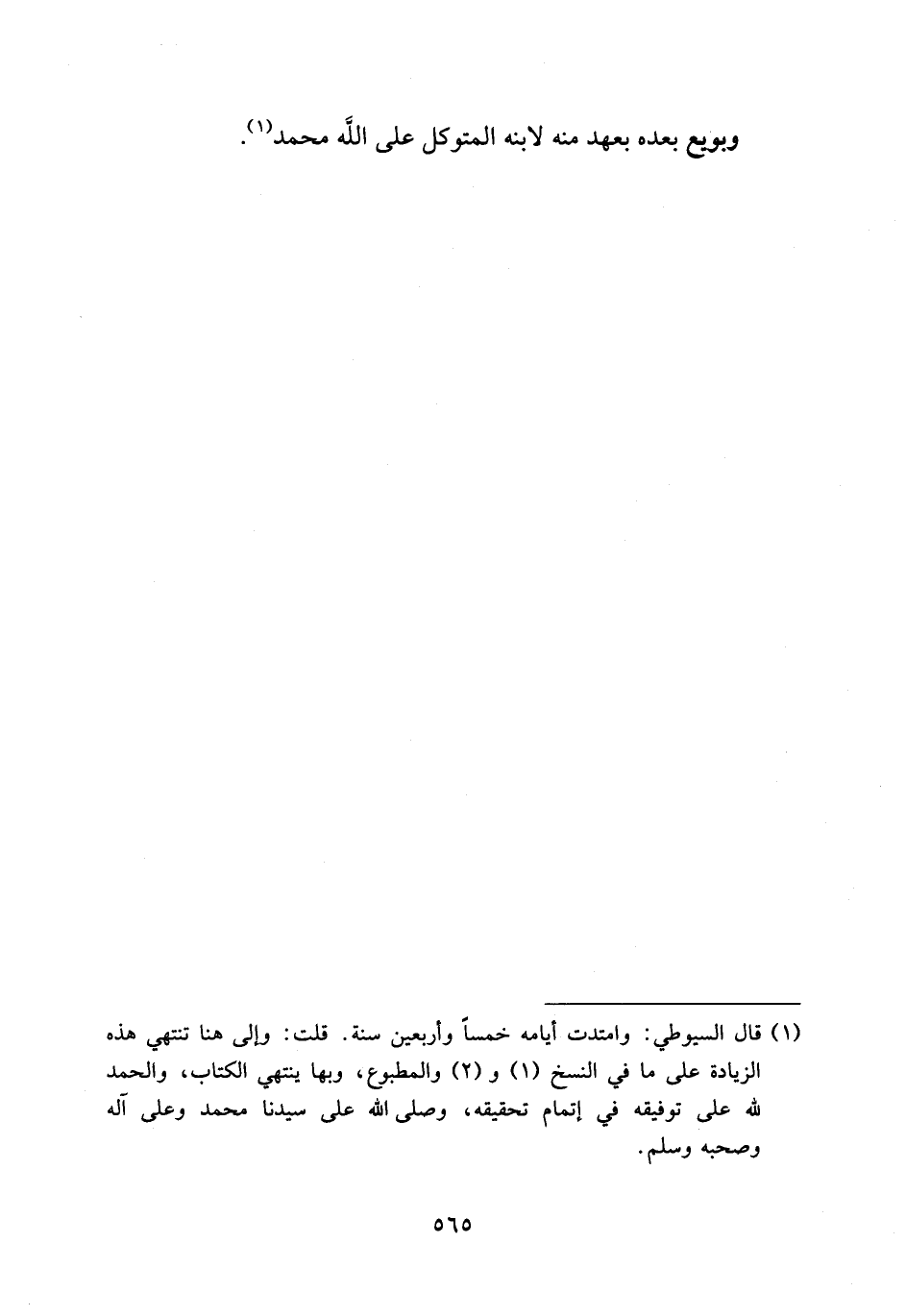 (¬1) قال السيوطي: وامتدت أيامه خمسا وأربعين سنة. قلت: وإلى هنا تنتهي هذه الزيادة على ما في النسخ (1) و (2) والمطبوع، وبها ينتهي الكتاب، والحمد لله على توفيقه في إتمام تحقيقه، وصلى الله على سيدنا محمد وعلى آله وصحبه وسلم.
