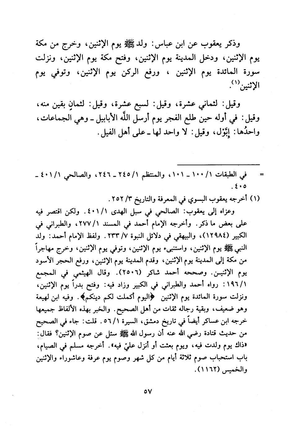 (¬1) أخرجه يعقوب البسوي في المعرفة والتاريخ 3/ 252. وعزاه إلى يعقوب: الصالحي في سبل الهدى 1/ 401. ولكن اقتصر فيه على بعض ما ذكر. وأخرجه الإمام أحمد في المسند 1/ 277، والطبراني في الكبير (12984)، والبيهقي في دلائل النبوة 7/ 233. ولفظ الإمام أحمد: ولد النبي صلى الله عليه وسلم يوم الإثنين، واستنبىء يوم الإثنين، وتوفي يوم الإثنين، وخرج مهاجرا من مكة إلى المدينة يوم الإثنين، وقدم المدينة يوم الإثنين، ورفع الحجر الأسود يوم الإثنين. وصححه أحمد شاكر (2506). وقال الهيثمي في المجمع 1/ 196: رواه أحمد والطبراني في الكبير وزاد فيه: وفتح بدرا يوم الإثنين، ونزلت سورة المائدة يوم الإثنين الْيَوْمَ أَكْمَلْتُ لَكُمْ دِينَكُمْ. وفيه ابن لهيعة وهو ضعيف، وبقية رجاله ثقات من أهل الصحيح. والخبر بهذه الألفاظ جميعها خرجه ابن عساكر أيضا في تاريخ دمشق، السيرة 1/ 56. قلت: جاء في الصحيح من حديث قتادة رضي الله عنه أن رسول الله صلى الله عليه وسلم سئل عن صوم الإثنين؟ فقال: «ذاك يوم ولدت فيه، ويوم بعثت أو أنزل عليّ فيه». أخرجه مسلم في الصيام، باب استحباب صوم ثلاثة أيام من كل شهر وصوم يوم عرفة وعاشوراء والإثنين والخميس (1162).