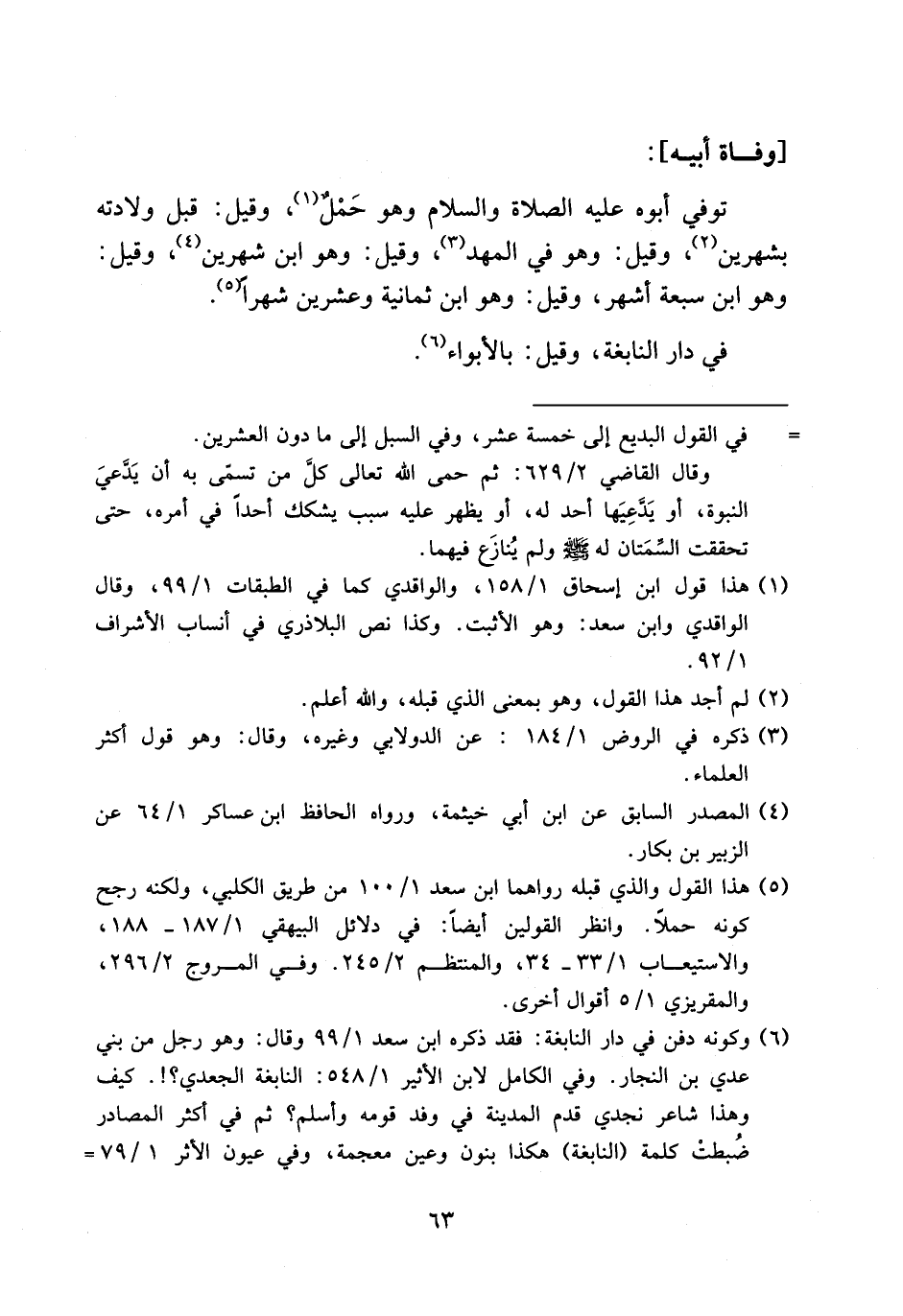 (¬6) وكونه دفن في دار النابغة: فقد ذكره ابن سعد 1/ 99 وقال: وهو رجل من بني عدي بن النجار. وفي الكامل لابن الأثير 1/ 548: النابغة الجعدي؟!. كيف وهذا شاعر نجدي قدم المدينة في وفد قومه وأسلم؟ ثم في أكثر المصادر ضبطت كلمة (النابغة) هكذا بنون وعين معجمة، وفي عيون الأثر 1/ 79 -