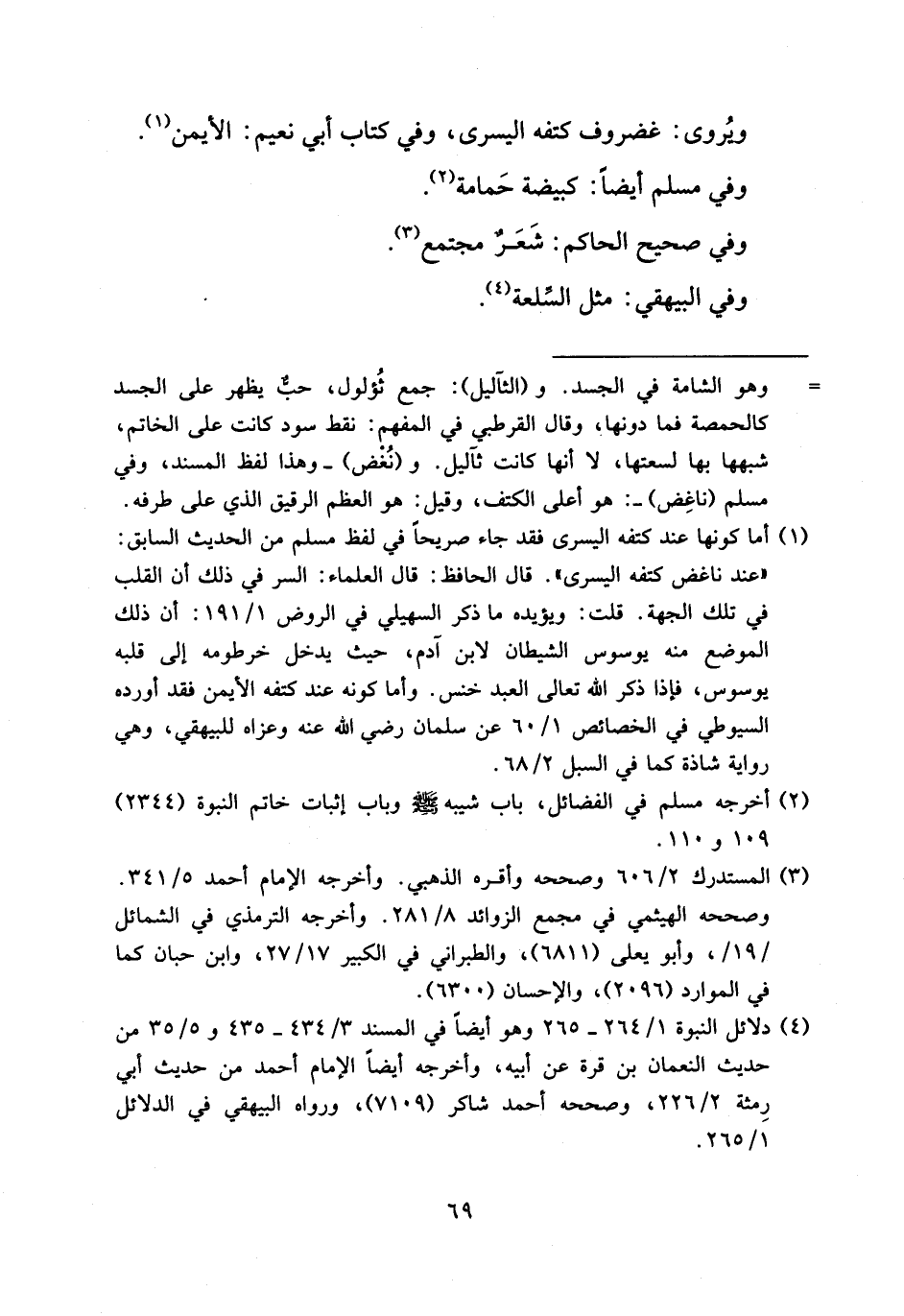 (¬2) أخرجه مسلم في الفضائل، باب شيبه صلى الله عليه وسلم وباب إثبات خاتم النبوة (2344) 109 و 110.