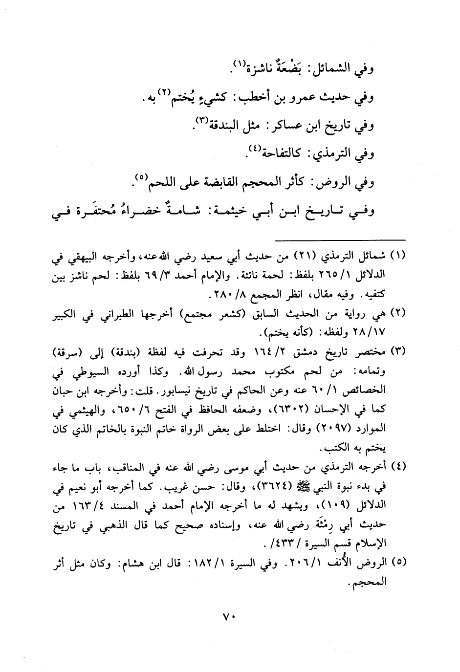 (¬3) مختصر تاريخ دمشق 2/ 164 وقد تحرفت فيه لفظة (بندقة) إلى (سرقة) وتمامه: من لحم مكتوب محمد رسول الله. وكذا أورده السيوطي في الخصائص 1/ 60 عنه وعن الحاكم في تاريخ نيسابور. قلت: وأخرجه ابن حبان كما في الإحسان (6302)، وضعفه الحافظ في الفتح 6/ 650، والهيثمي في الموارد (2097) وقال: اختلط على بعض الرواة خاتم النبوة بالخاتم الذي كان يختم به الكتب.