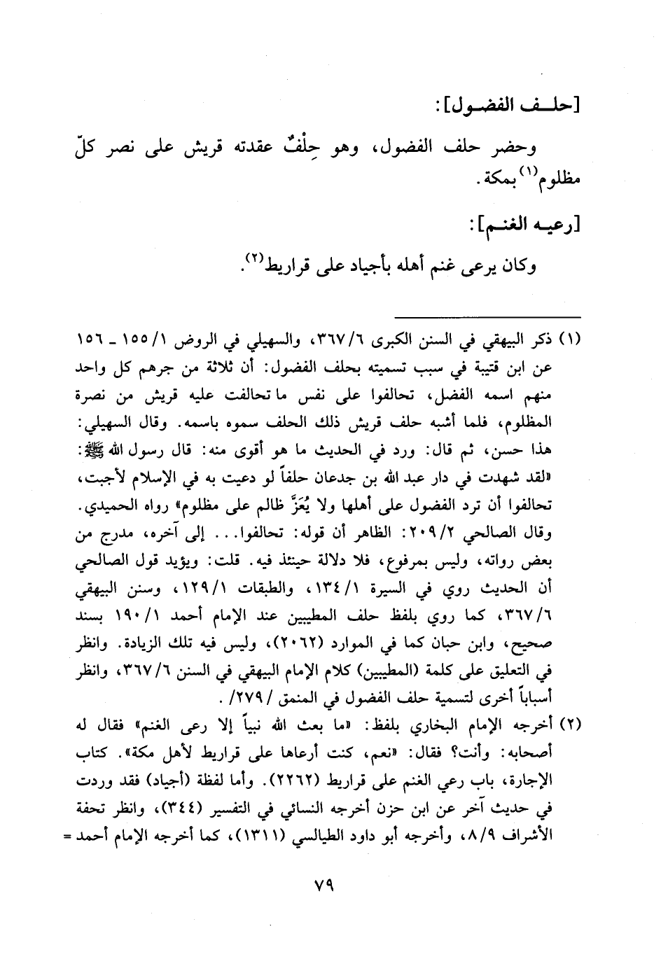 (¬1) ذكر البيهقي في السنن الكبرى 6/ 367، والسهيلي في الروض 1/ 155 - 156 عن ابن قتيبة في سبب تسميته بحلف الفضول: أن ثلاثة من جرهم كل واحد منهم اسمه الفضل، تحالفوا على نفس ما تحالفت عليه قريش من نصرة المظلوم، فلما أشبه حلف قريش ذلك الحلف سموه باسمه. وقال السهيلي: هذا حسن، ثم قال: ورد في الحديث ما هو أقوى منه: قال رسول الله صلى الله عليه وسلم: «لقد شهدت في دار عبد الله بن جدعان حلفا لو دعيت به في الإسلام لأجبت، تحالفوا أن ترد الفضول على أهلها ولا يعزّ ظالم على مظلوم» رواه الحميدي. وقال الصالحي 2/ 209: الظاهر أن قوله: تحالفوا. . . إلى آخره، مدرج من بعض رواته، وليس بمرفوع، فلا دلالة حينئذ فيه. قلت: ويؤيد قول الصالحي أن الحديث روي في السيرة 1/ 134، والطبقات 1/ 129، وسنن البيهقي 6/ 367، كما روي بلفظ حلف المطيبين عند الإمام أحمد 1/ 190 بسند صحيح، وابن حبان كما في الموارد (2062)، وليس فيه تلك الزيادة. وانظر في التعليق على كلمة (المطيبين) كلام الإمام البيهقي في السنن 6/ 367، وانظر أسبابا أخرى لتسمية حلف الفضول في المنمق/279/.