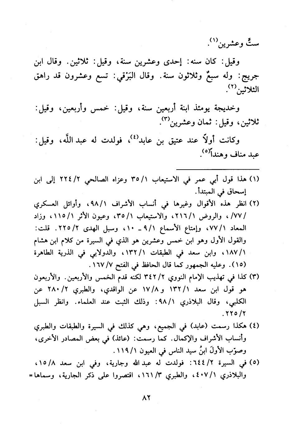 (¬2) انظر هذه الأقوال وغيرها في أنساب الأشراف 1/ 98، وأوائل العسكري /77/، والروض 1/ 216، والاستيعاب 1/ 35، وعيون الأثر 1/ 115، وزاد المعاد 1/ 77، وإمتاع الأسماع 1/ 9 - 10، وسبل الهدى 2/ 225. قلت: والقول الأول وهو ابن خمس وعشرين هو الذي في السيرة من كلام ابن هشام 1/ 187، وابن سعد في الطبقات 1/ 132، والدولابي في الذرية الطاهرة (15). وعليه الجمهور كما قال الحافظ في الفتح 7/ 167.