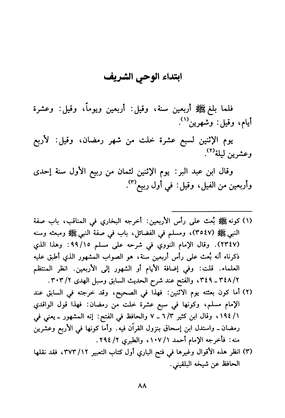 (¬2) أما كون بعثته يوم الاثنين: فهذا في الصحيح، وقد خرجته في السابق عند الإمام مسلم، وكونها في سبع عشرة خلت من رمضان: فهذا قول الواقدي 1/ 194، وقال ابن كثير 3/ 6 - 7 والحافظ في الفتح: إنه المشهور-يعني في رمضان-واستدل ابن إسحاق بنزول القرآن فيه. وأما كونها في الأربع وعشرين منه: فأخرجه الإمام أحمد 1/ 107، والطبري 2/ 294.