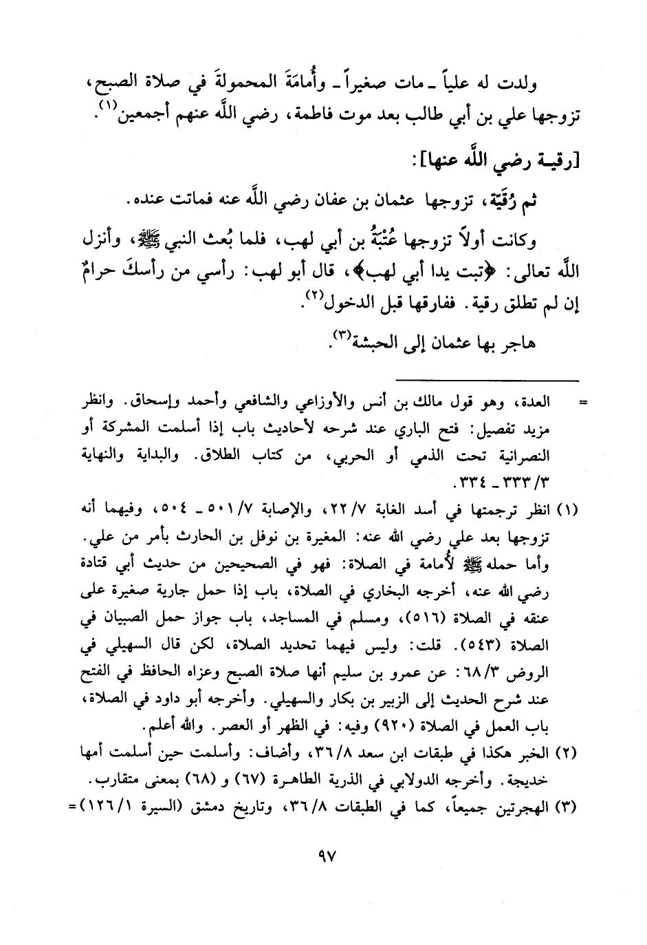 (¬1) انظر ترجمتها في أسد الغابة 7/ 22، والإصابة 7/ 501 - 504، وفيهما أنه تزوجها بعد علي رضي الله عنه: المغيرة بن نوفل بن الحارث بأمر من علي. وأما حمله صلى الله عليه وسلم لأمامة في الصلاة: فهو في الصحيحين من حديث أبي قتادة رضي الله عنه، أخرجه البخاري في الصلاة، باب إذا حمل جارية صغيرة على عنقه في الصلاة (516)، ومسلم في المساجد، باب جواز حمل الصبيان في الصلاة (543). قلت: وليس فيهما تحديد الصلاة، لكن قال السهيلي في الروض 3/ 68: عن عمرو بن سليم أنها صلاة الصبح وعزاه الحافظ في الفتح عند شرح الحديث إلى الزبير بن بكار والسهيلي. وأخرجه أبو داود في الصلاة، باب العمل في الصلاة (920) وفيه: في الظهر أو العصر. والله أعلم.