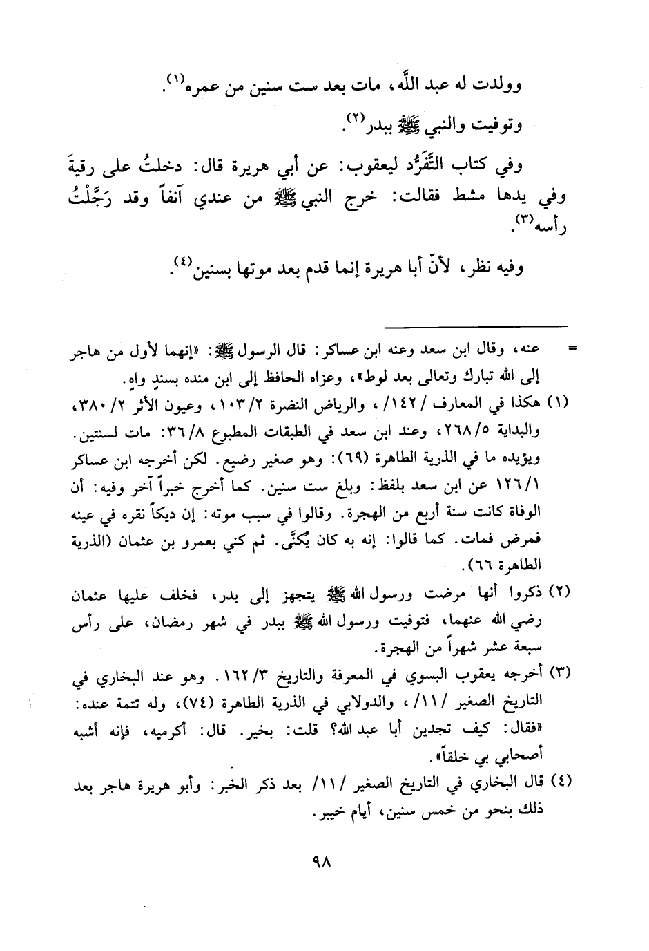 (¬1) هكذا في المعارف/142/، والرياض النضرة 2/ 103، وعيون الأثر 2/ 380، والبداية 5/ 268، وعند ابن سعد في الطبقات المطبوع 8/ 36: مات لسنتين. ويؤيده ما في الذرية الطاهرة (69): وهو صغير رضيع. لكن أخرجه ابن عساكر 1/ 126 عن ابن سعد بلفظ: وبلغ ست سنين. كما أخرج خبرا آخر وفيه: أن الوفاة كانت سنة أربع من الهجرة. وقالوا في سبب موته: إن ديكا نقره في عينه فمرض فمات. كما قالوا: إنه به كان يكنّى. ثم كني بعمرو بن عثمان (الذرية الطاهرة 66).