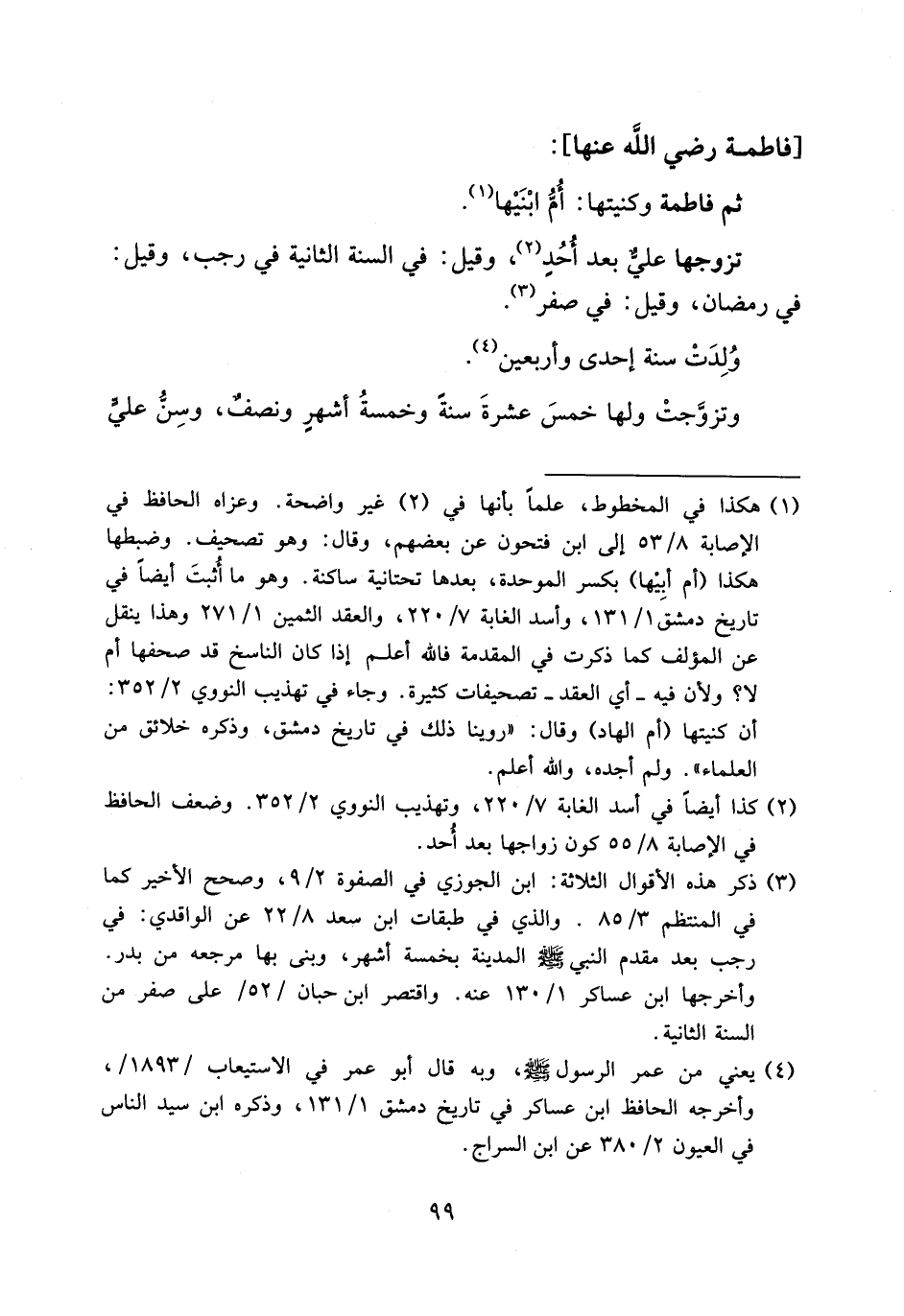 (¬3) ذكر هذه الأقوال الثلاثة: ابن الجوزي في الصفوة 2/ 9، وصحح الأخير كما في المنتظم 3/ 85. والذي في طبقات ابن سعد 8/ 22 عن الواقدي: في رجب بعد مقدم النبي صلى الله عليه وسلم المدينة بخمسة أشهر، وبنى بها مرجعه من بدر. وأخرجها ابن عساكر 1/ 130 عنه. واقتصر ابن حبان/52/على صفر من السنة الثانية.