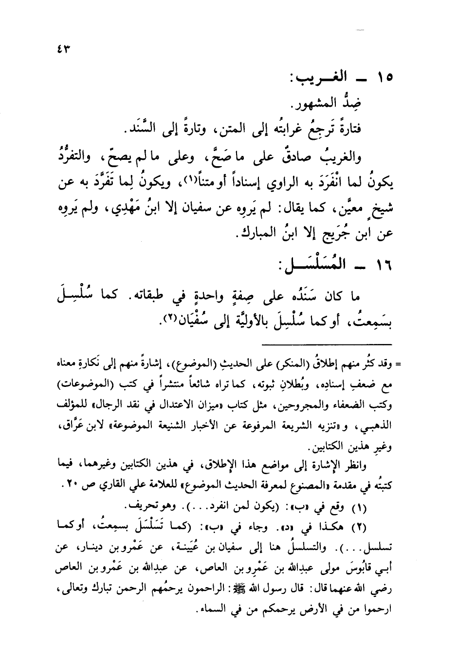 ضِدُّ المشهور. فتارةً ترجعُ غرابتُه إلى المتن، وتارةً إلى السَّنَد. ... والغريبُ صادقٌ على ما صَحَّ، وعَلَى ما لم يصحّ. والتفرُّدُ يكونُ لِمَا انْفَرَدَ به الراوي إسناداً أو متناً، ويكونُ لِمَا تَفَرَّدَ به عن شيخٍ معيَّن. كما يقال: "لم يَروِه عن سفيان إلا ابنُ مَهْدِيّ"، و: "لم يَروِه عن ابن جريج إلا ابنُ المبارك".