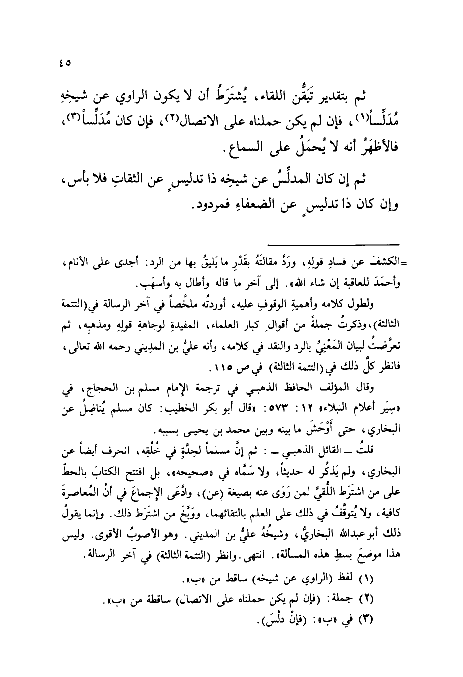 ثم بتقدير تَيَقُّن اللقاء، يُشْتَرَطُ أن لا يكون الراوي عن شيخِهِ مُدَلِّساً. فإن لم يكن، حَمَلناه على الاتصال. فإن كان مُدَلِّساً، فالأظهَرُ (¬1) أنه لا يُحْمَلُ على السماع.