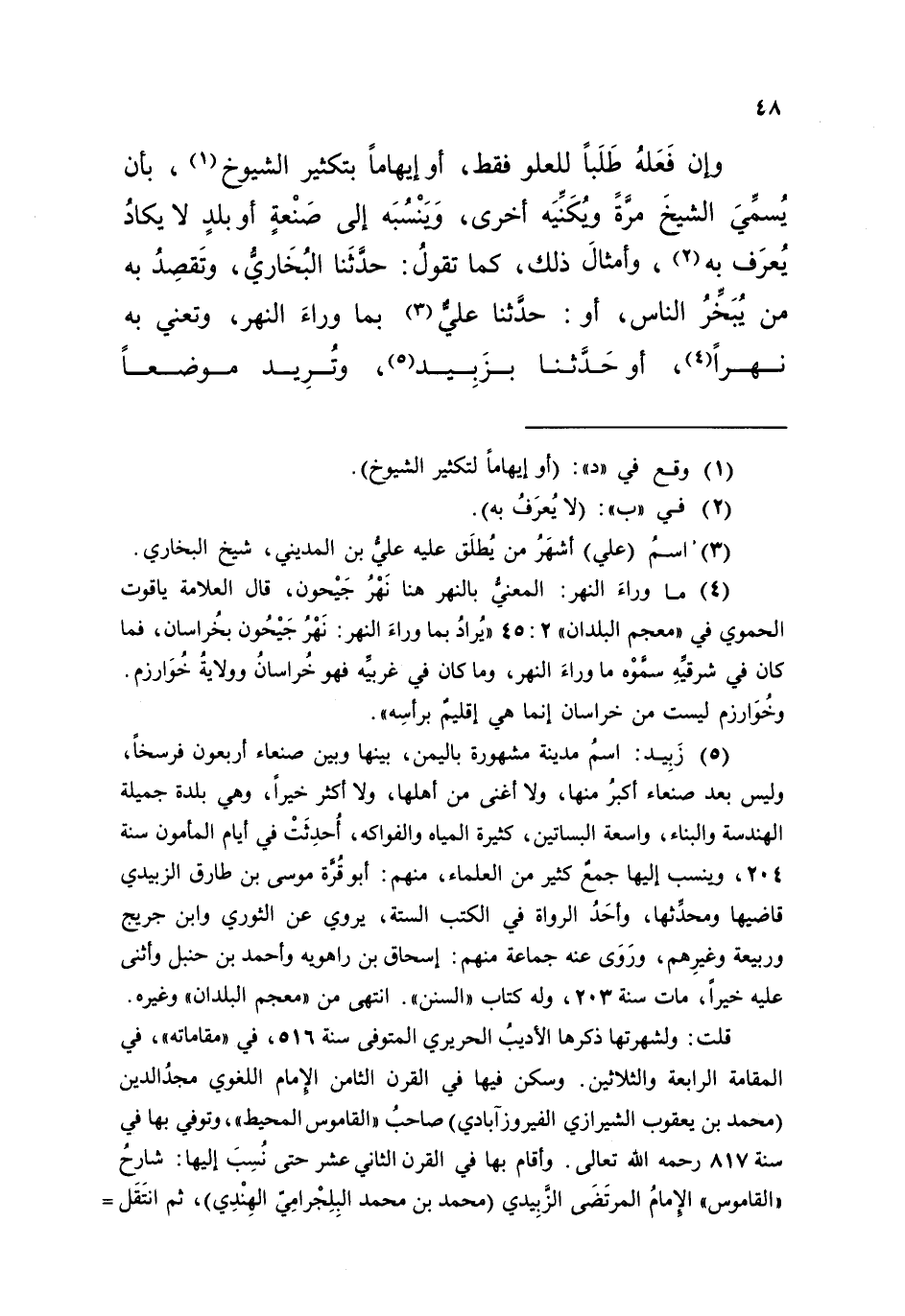 - وإن فَعَلهُ طَلَباً للعلو فقط، أو إيهاماً بتكثير الشيوخ، بأن يُسمِّي الشيخَ مرَّةً ويُكَنِّيه أخرى، وَيَنْسُبَه إلى صَنْعةٍ أو بلدٍ لا يكادُ يُعرَف به، وأمثالَ ذلك - كما تقولُ: "حدَّثَنا البُخَاريُّ"، وتَقصِدُ به من يُبَخِّرُ الناس، أو: "حدَّثنا عَلِيٌّ بما وراءَ النهر"، وتعني به نهراً، أو: "حَدَّثنا بزَبِيد (¬1) "، وتُرِيد موضعاً