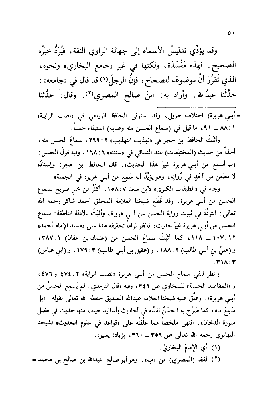 وقد يؤدِّي تدليسُ الأسماء إلى جهالةِ الراوي الثقة، فيُرَدُّ خبَرُه الصحيح! فهذه مَفْسَدَة، ولكنها في غير "جامع البخاريّ" ونحوِه، الذي تَقرَّرَ أنَّ موضوعَه للصحاح. فإنَّ الرجلَ قد قال في جامعه: "حدَّثنا عبدُ الله"، وأراد به: ابنَ صالح المصري. وقال: "حدَّثنا