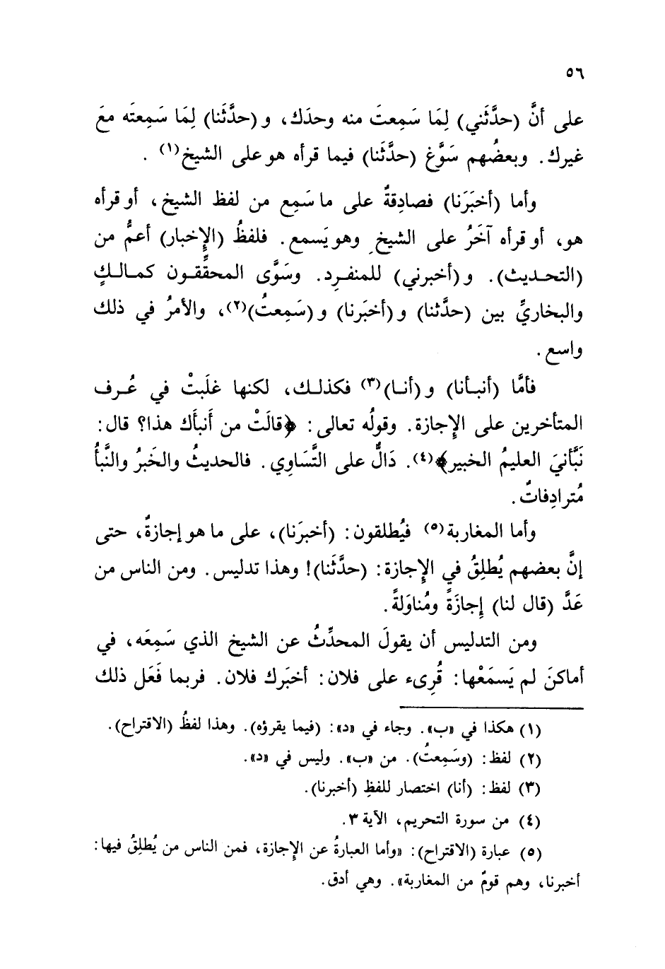 فأمَّا "أنبأنا" و "أنا"، فكذلك، لكنها غلَبتْ في عُرف المتأخرين عَلَى الإجازة. وقولُه تعالى: {قَالَتْ مَنْ أَنبَأَكَ هَذَا قَالَ نَبَّأَنِيَ الْعَلِيمُ الْخَبِيرُ} دَالُّ على التَّساوِي. فالحديثُ والخبرُ والنَّبأُ مُترادِفات. وأما المغاربة فيُطلقون: "أخبرَنا"، عَلَى ما هو إجازة، حتى إنَّ بعضهم يُطلقُ في الإجازة: "حدَّثَنا"! وهذا تدليس. ومِن الناس مَن عَدَّ "قال لنا" إِجازَةً ومُناوَلةً.