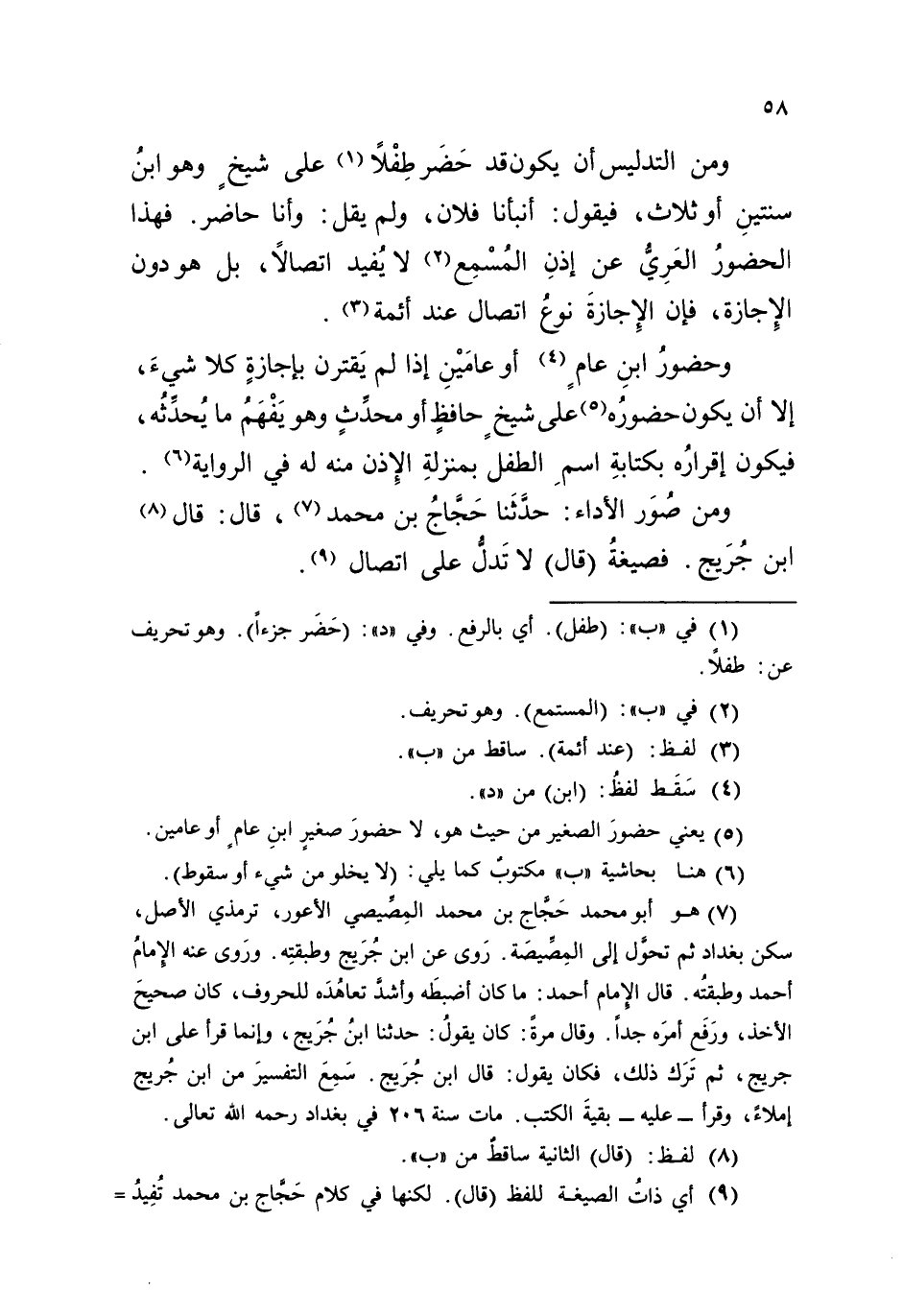 ومِن التدليس أن يكون قد حَضَر طِفْلاً (¬1) على شيخٍ وهو ابنُ سنتينِ أو ثلاث، فيقول: "أنبأنا فلان"، ولم يقل: "وأنا حاضر". فهذا الحضورُ العَرِيُّ عن إذنِ المُسْمِع لا يُفيد اتصالاً، بل هو دون الإجازة، فإن الإجازة نوعُ اتصالٍ عند (¬2) أئمة (¬3) .