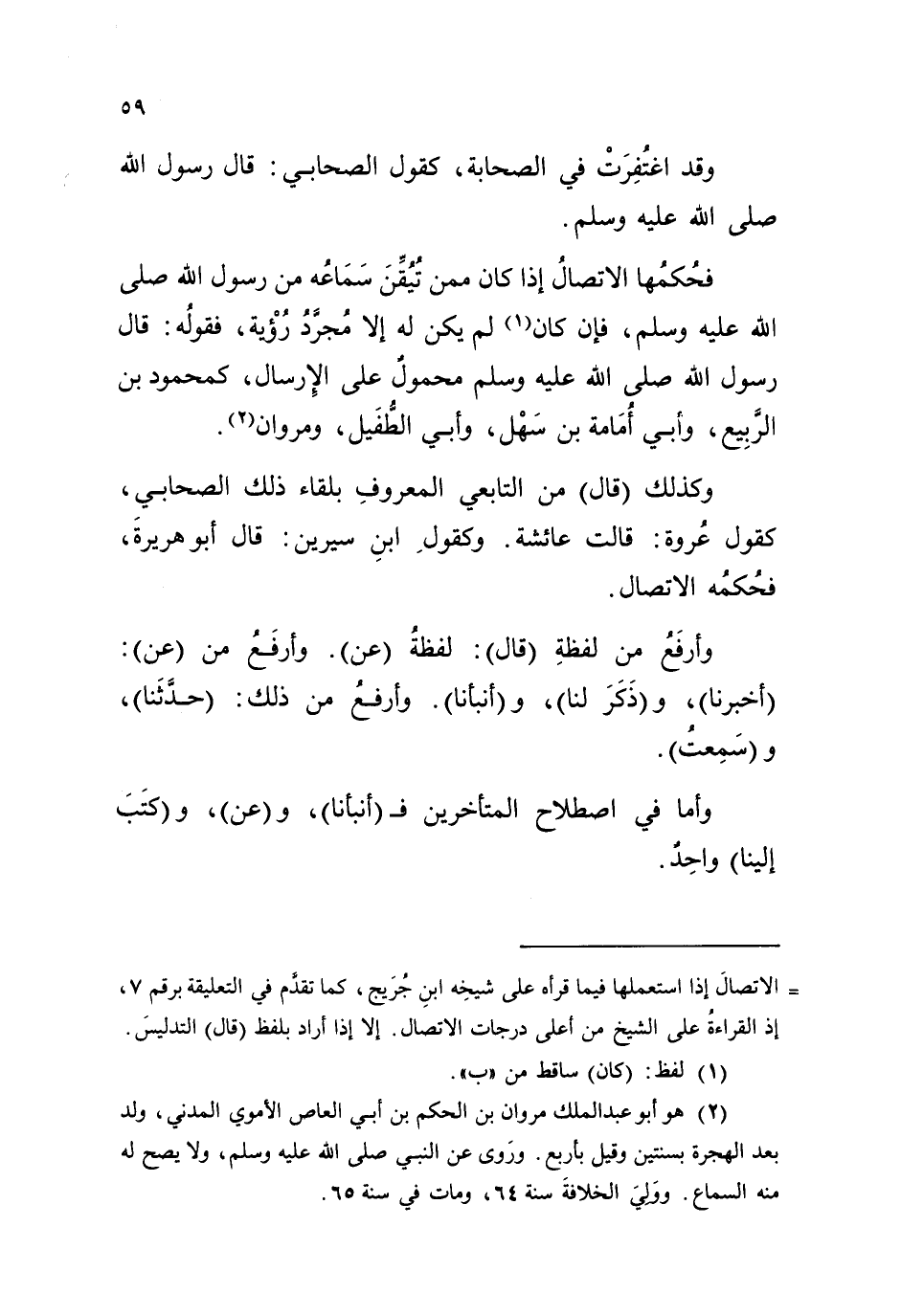 وقد اغتُفِرَتْ في الصحابة، كقول الصحابيّ: "قال رسول الله - صلى الله عليه وسلم - ". فحُكْمُها الاتصالُ، إذا كان مِمَّن تُيُقِّنَ سَمَاعُه من رسول الله - صلى الله عليه وسلم -. فإن كان لم يكن له إلا مُجرَّدُ رُؤْية، فقولُه: "قال رسول الله - صلى الله عليه وسلم - " محمولٌ على الإرسال. كـ: محمود بن الرَّبِيع، وأبي أُمَامة بن سَهْل، وأبي الطُّفَيل، ومروان.