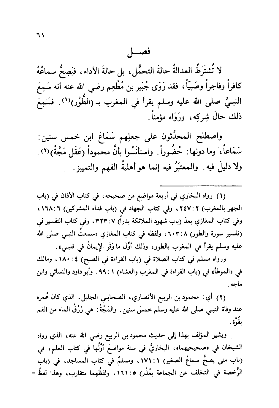 واصطلح المحدِّثون (¬2) على جَعْلِهم سَمَاعَ ابن خمس سنين: سَمَاعاً، وما دونها: حُضُوراً. واستأنَسُوا بأنَّ محموداً (¬3) عَقَل مَجَّةً (¬4) ، ولا دليلَ فيه. والمعتبَرُ فيه إنما هو أهليةُ الفهم والتمييز.