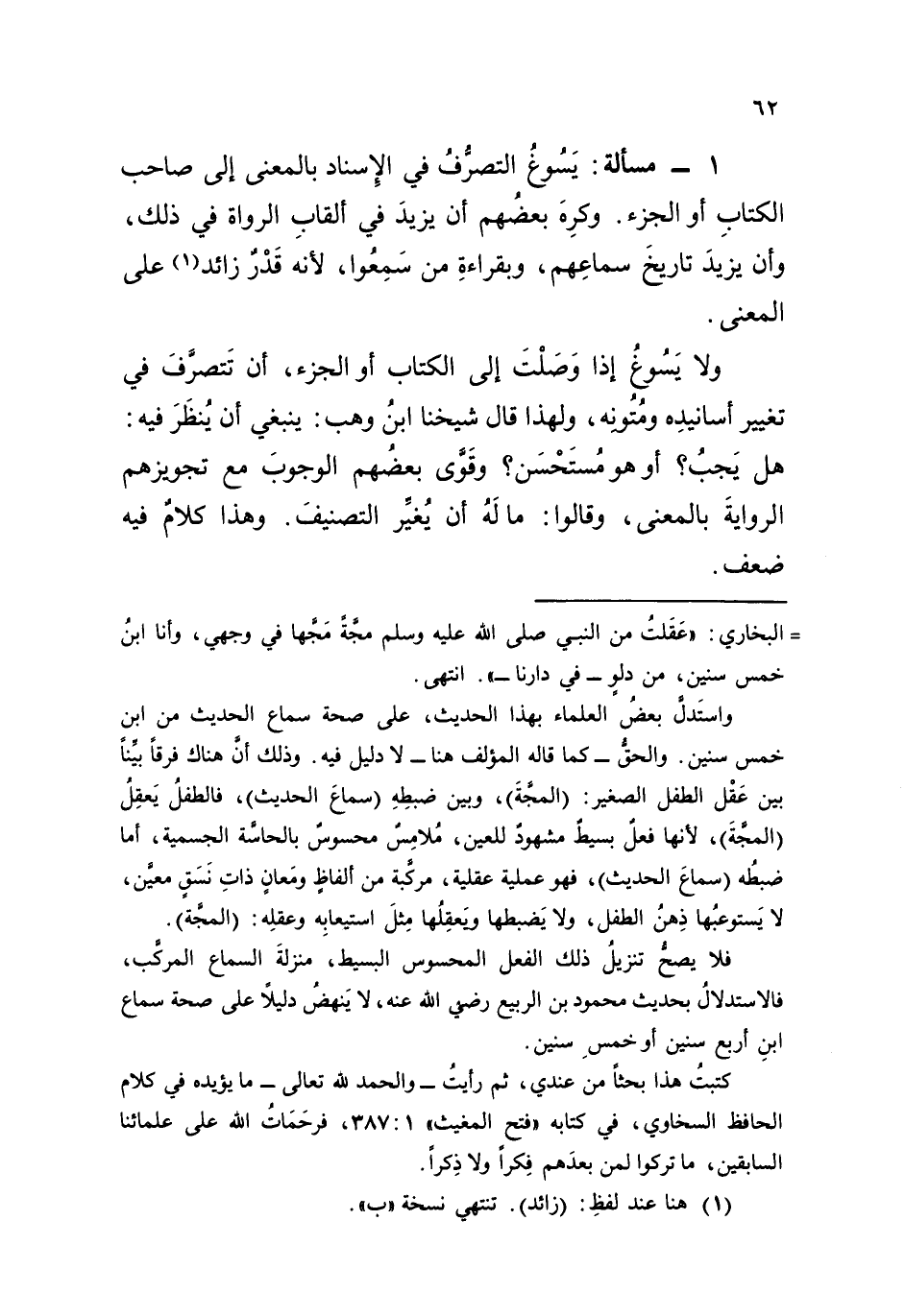 يَسُوغُ التصرُّفُ في الإسناد بالمعنى إلى صاحب الكتابِ أو الجزء. وكرِهَ بعضُهم أن يزيدَ في ألقابِ الرواة في ذلك، وأن يزيدَ تاريخَ سماعِهم، وبقراءةِ مَن سَمِعُوا، لأنه قَدْرٌ زائدٌ عَلَى المعنَى.