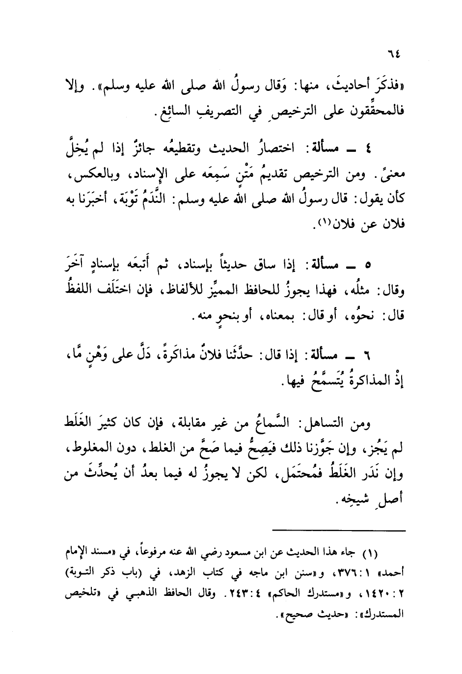 اختصارُ الحديث وتقطيعُه جائزٌ إذا لم يُخِلَّ معنىً. ومِن الترخيصِ تقديمُ مَتْنٍ سَمِعهَ على الإسناد، وبالعكس. كأن يقول: "قال رسولُ الله - صلى الله عليه وسلم -: (النَّدَمُ تَوْبَة) . أخبَرَنا به: فلان، عن فلان".