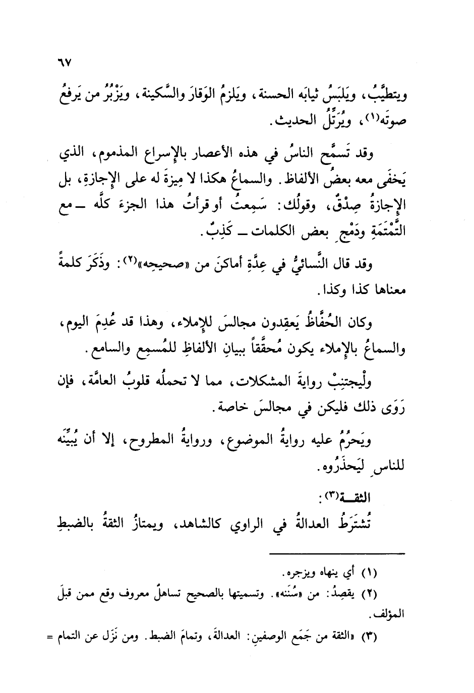 وقد تَسمَّح الناسُ في هذه الأعصار بالإسراع المذموم، الذي يَخفَى معه بعضُ الألفاظ. والسماعُ هكذا لا ميزة له على الإجازة، بل الإجازةُ صِدْقٌ. وقولُك: "سَمِعتُ – أو قرأتُ – هذا الجزءَ كلَّه" مع التَّمْتَمَةِ ودَمْجِ بعض الكلمات: كَذِبٌ.