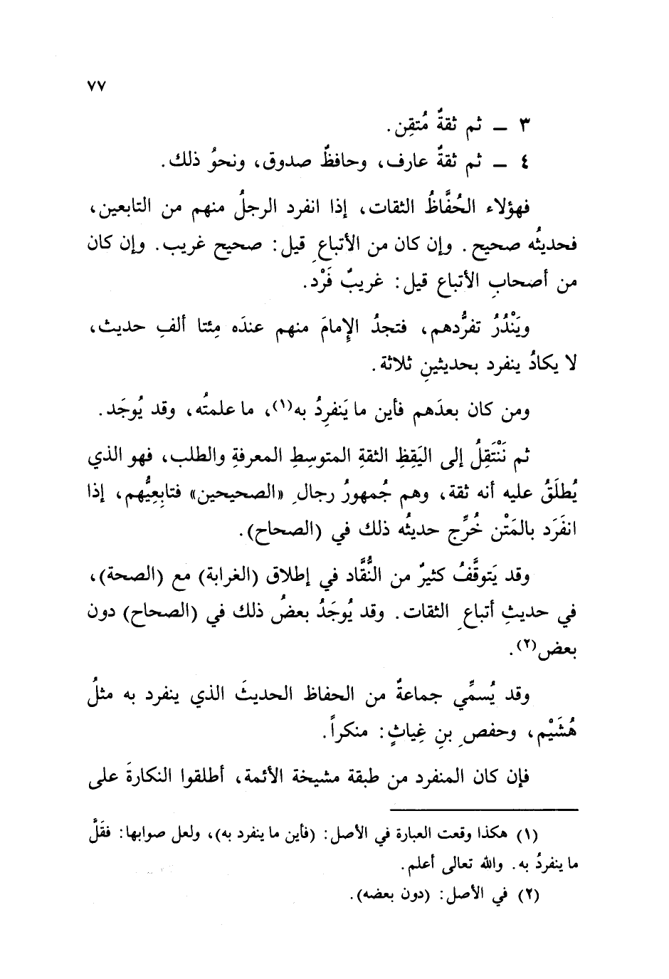 فهؤلاء الحُفَّاظُ الثقات: إذا انفردَ الرجلُ مِنهم مِن التابعين، فحديثهُ: (صحيحٌ) . وإن كان مِن الأتباعِ، قيل: (صحيحٌ، غريبٌ) . وإن كان مِن أصحاب الأتباع، قيل: (غريبٌ، فَرْدٌ) . ويَنْدُرُ تفرُّدهم، فتجدُ الإمامَ مِنهم عندهَ مِئتا ألف حديث، لا يكادُ ينفرد بحديثينِ ثلاثة! ومَن كان بعدَهم: فأين ما يَنفرِدُ به؟ ما عَلِمْتُهُ، وقد يوُجَد.