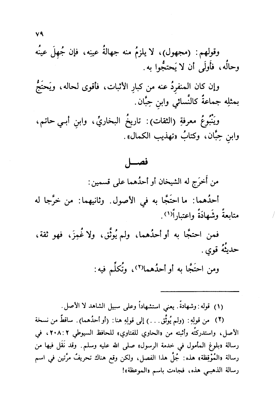 وقولُهم: "مجهول"، لا يلزمُ منه جهالةُ عينِه. فإن جُهِلَ عينُه وحالُه، فأَولَى أن لا يَحتجُّوا به. وإن كان المنفردُ عنه مِن كبارِ الأثبات، فأقوى لحاله، ويَحتَجُّ بمثلِه جماعةٌ كالنَّسائيّ وابنِ حِباَّن.