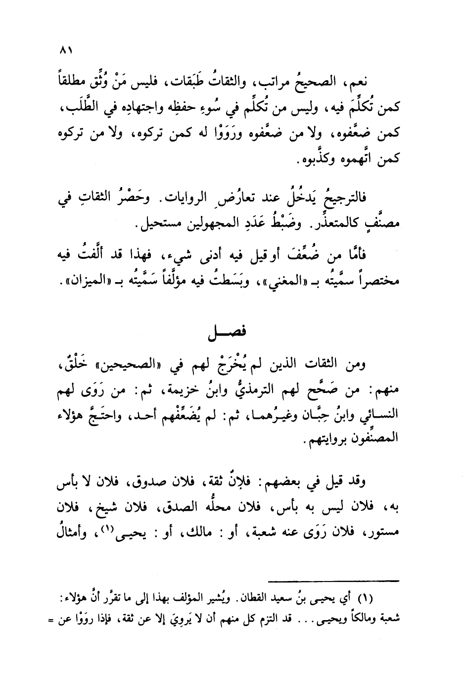 وقد قيل في بعضهم: "فلانٌ ثقة"، "فلان صدوق"، "فلان لا بأس به"، "فلان ليس به بأس"، "فلان محلُّه الصدق"، "فلان شيخ"، "فلان مستور"، "فلان رَوَى عنه شعبة، أو مالك، أو يحيى". وأمثالُ