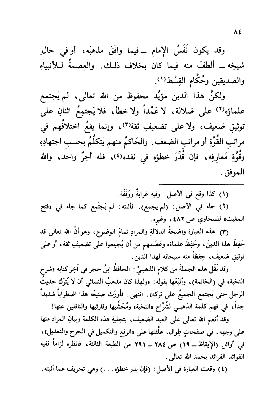 ولكنَّ هذا الدينَ مؤيَّدٌ محفوظٌ مِن الله تعالى، لم يَجتمع علماؤه عَلَى ضلالة، لا عَمْداً ولا خطأ. فلا يَجتمِعُ اثنانِ عَلَى توثيقِ ضعيف، ولا عَلَى تضعيفِ ثقة. وإنما يقعُ اختلافُهم في مراتبِ القُوَّةِ أو مراتبِ الضعف. والحَاكمُ مِنهم يَتكلَّمُ بحسبِ اجتهادِهِ، وقُوَّةِ مَعارِفِه. فإن قُدِّرَ (¬1) خطؤه في نقده، فله أجرٌ واحدٌ، والله الموفق.