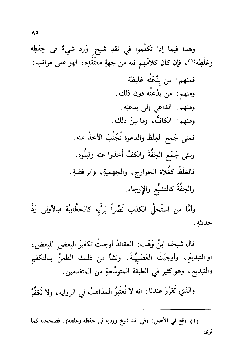 قال شيخنا ابنُ وَهْب: العقائدُ أَوجبَتْ تكفيرَ البعضِ للبعض، أو التبديعَ، وأَوجبَتْ العَصَبِيَّةَ. ونشأ من ذلك الطعنُ بالتكفيرِ والتبديع، وهو كثيرٌ في الطبقة المتوسِّطةِ من المتقدمين. والذي تَقرَّرَ عندنا: أنه لا تُعتَبرُ المذاهبُ في الرواية، ولا نُكفِّرُ (¬2)