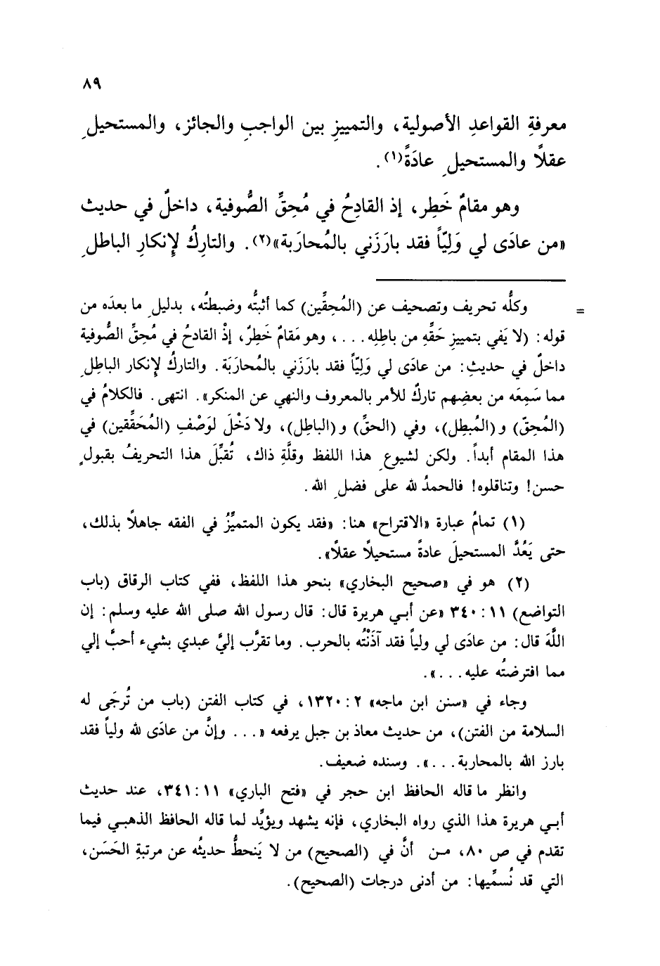 وهو مقامٌ خَطِر، إذ القادِحُ في مُحِقِّ الصُّوفية داخلٌ في حديث: (مَن عادَى لي وَلِيّاً، فقد بارَزَني بالمُحارَبة) . والتارِكُ لإنكارِ الباطلِ