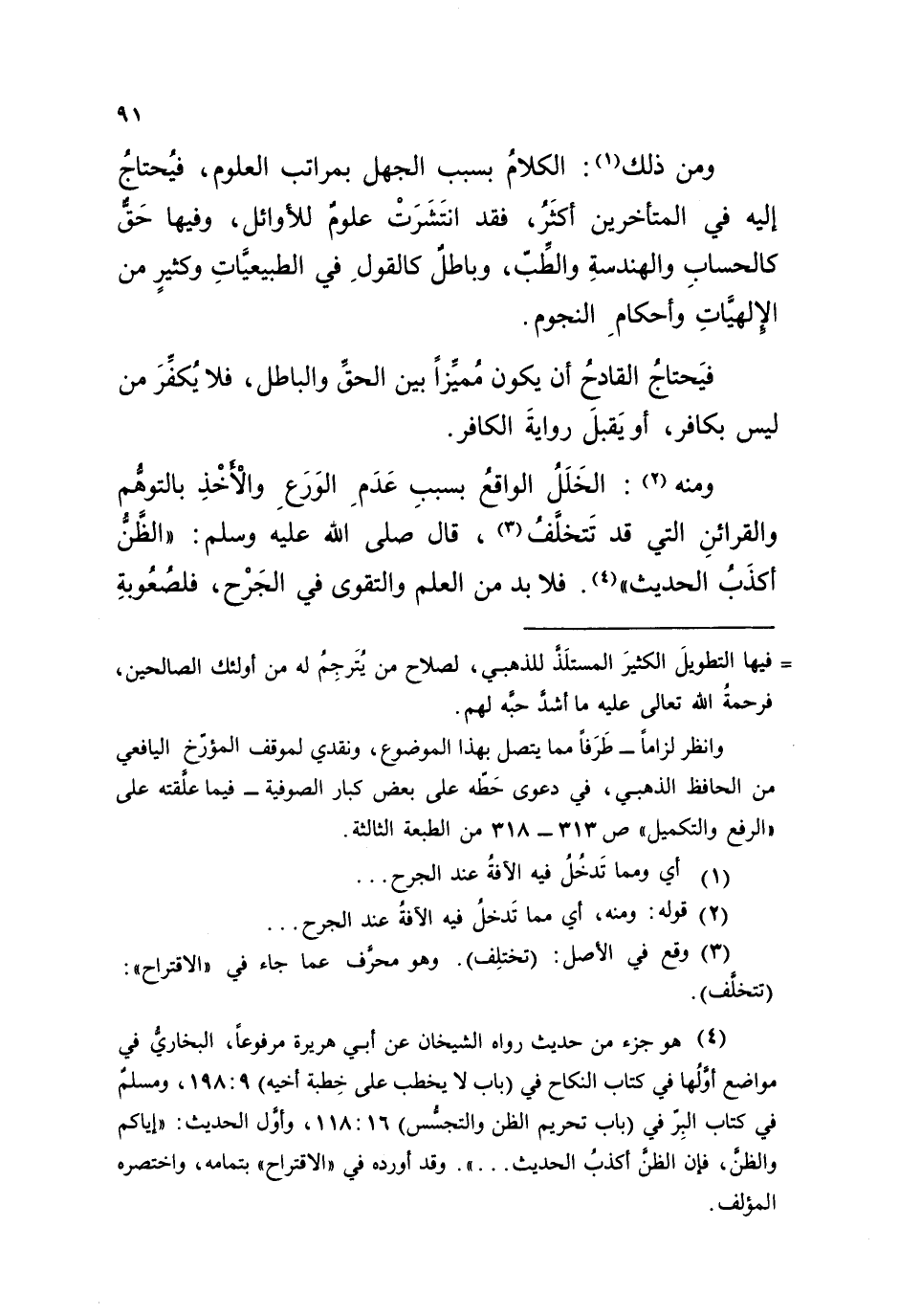 ومِن ذلك: الكلامُ بسبب الجهل بمراتب العلوم، فيُحتاجُ إليه في المتأخرين أكثَرُ. فقد انتَشَرَتْ علومٌ للأوائل وفيها حَقٌّ: كالحسابِ والهندسةِ والطِّبٌ، وباطلّ: كالقولِ في الطبيعيَّاتِ وكثيرٍ من الإلهيَّاتِ وأحكامِ النجوم. فيَحتاجُ القادحُ أن يكون مُميِّزاً بين الحقِّ والباطل، فلا يُكفِّرَ مَن ليس بكافر، أو يَقبلَ رواية الكافر.