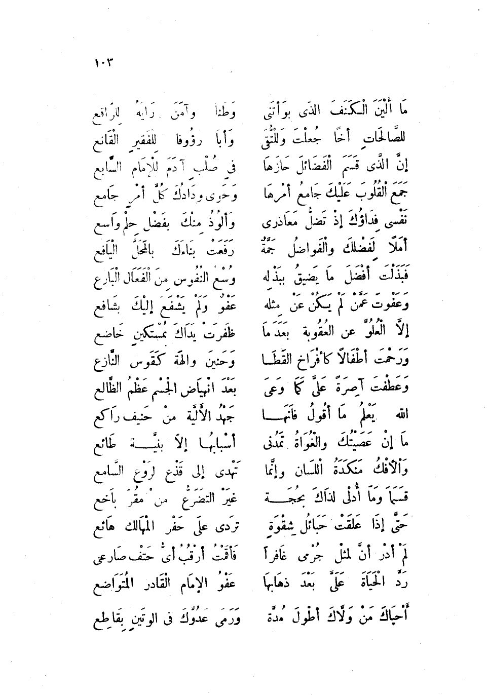 (إِن الَّذِي قسم الْفَضَائِل حازها ... فِي صلب آدم للْإِمَام السَّابِع)