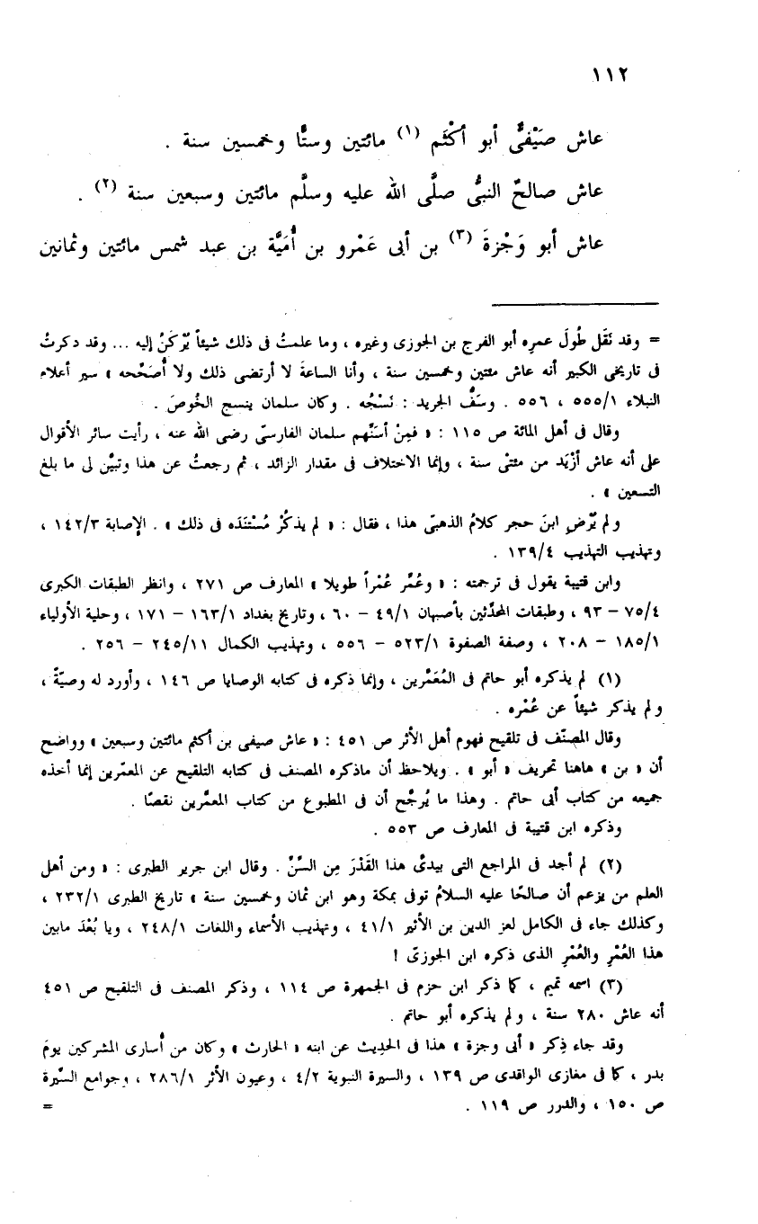 وقال المصنّف فى تلقيح فهوم أهل الأثر ص ٤٥١: "عاش صيفى بن أكثم مائتين وسبعين" وواضح أن "بن" هاهنا تحريف "أبو". ويلاحظ أن ما ذكره المصنف فى كتابه التلقيح عن المعمّرين إنما أخذه جميعه من كتاب أبى حاتم. وهذا ما يُرجِّح أن فى المطبوع من كتاب المعمّرين نقصًا.