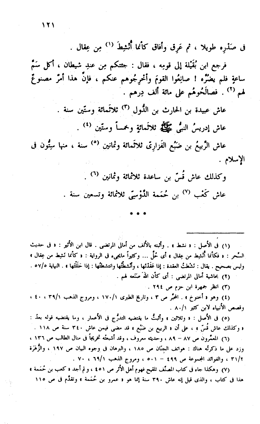(¬٥) فى الأصل: "وثلاثين"، وأثبتُّ ما يقتضيه التدرُّج فى الأعمار، وما يقتضيه قوله بعدُ: "وكذلك عاش قُسّ"، على أن "الربيع بن ضَبُع" قد مضى فيمن عاش ٣٤٠ سنة ص ١١٨.