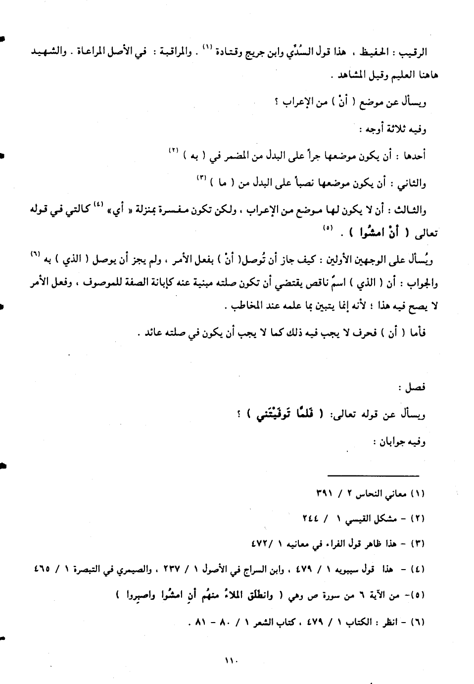 ويُسأل على الوجهين الأولين: كيف جاز أنّ تُوصل (أنّ) بفعل الأمر، ولم يجز أن يوصل (الذي) به والجواب: أنّ (الذي) اسمٌ ناقص يقتضي أنّ تكون صلته مبنية عنه كإبانة الصفة للموصوف، وفعل الأمر لا يصح فيه هذا؛ لأنَّه إنما يتبين بما علمه عند المخاطب.